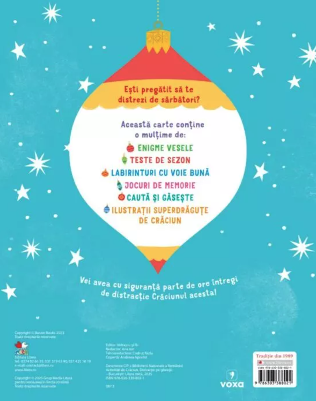 Esti pregatit sa te distrezi de sarbatori?Aceasta carte contine o multime de:ENIGME VESELETESTE DE SEZONLABIRINTURI CU VOIE BUNAJOCURI DE MEMORIECAUTA SI GASESTEILUSTRATII SUPERDRAGUTE DE CRACIUNVei avea cu siguranta parte de ore intregi de distractie Craciunul acesta!