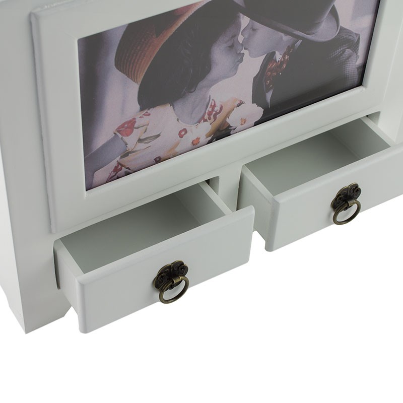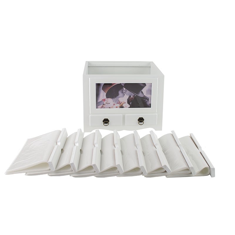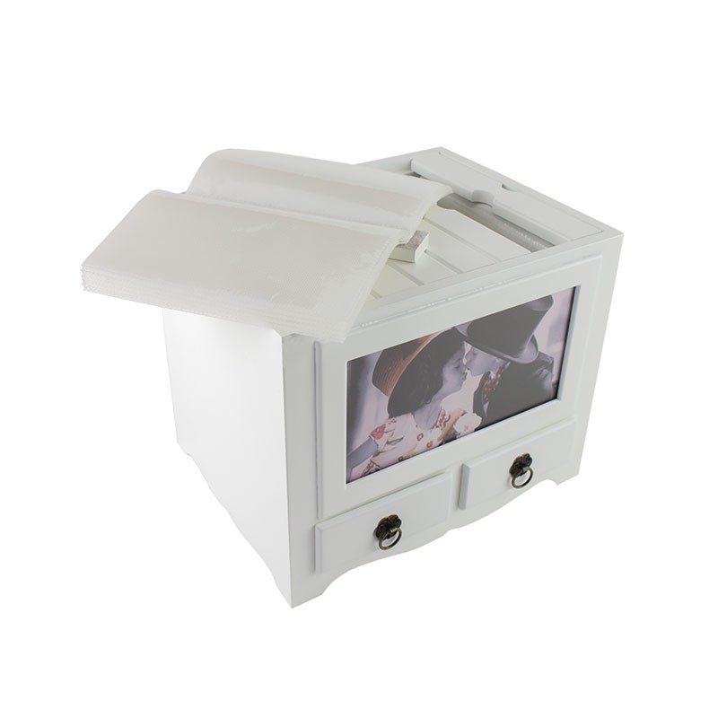 Album foto 10x15, din lemn, cu 2 sertare, 10X15, 192 poze, alb, Resigilat Album foto 10x15, din lemn, cu 2 sertare, 10X15, 192 poze, alb, prezinta mici lovituri si zgarieturi Albumul foto personalizabil din lemn, cu doua sertare, are aspectul unei cutii originale in care poti pastra cele mai frumoase amintiri, fie ele fotografii sau mici obiecte importante pentru tine. Acest aspect special face albumul sa fie o piesa interesanta de decor, pentru casa sau birou, care va impresiona familia si prietenii. Albumul dispune de opt sertare speciale care pot stoca pana la 192 fotografii in format 10X15 cm. Fiecare sertar are inserate 12 file cu buzunare de tip slip-in pentru a face cat mai comoda si placuta rememorarea momentelor speciale. Partea din fata a albumului este prevazuta cu o fereastra, cu aspectul unei rame foto, unde poti pune fotografia preferata, si cu doua sertare cu manere, pentru un acces facil la obiectele dragi. Albumul este confectionat integral din lemn de culoare alba, cu finisaje atente, iar sertarele au insertie metalica cu aspect vintage. Acest album foto personalizabil din lemn, prevazut cu sertare, este un cadou frumos pentru o persoana draga! Caracteristici: - format poze 10x15; - capacitate album 192 fotografii; - material lemn; - personalizabil cu fereastra ce poate gazdui o fotografie 9X17 cm; - prevazut cu doua sertare; - culoare alb; - dimensiuni 24x20x20 cm.