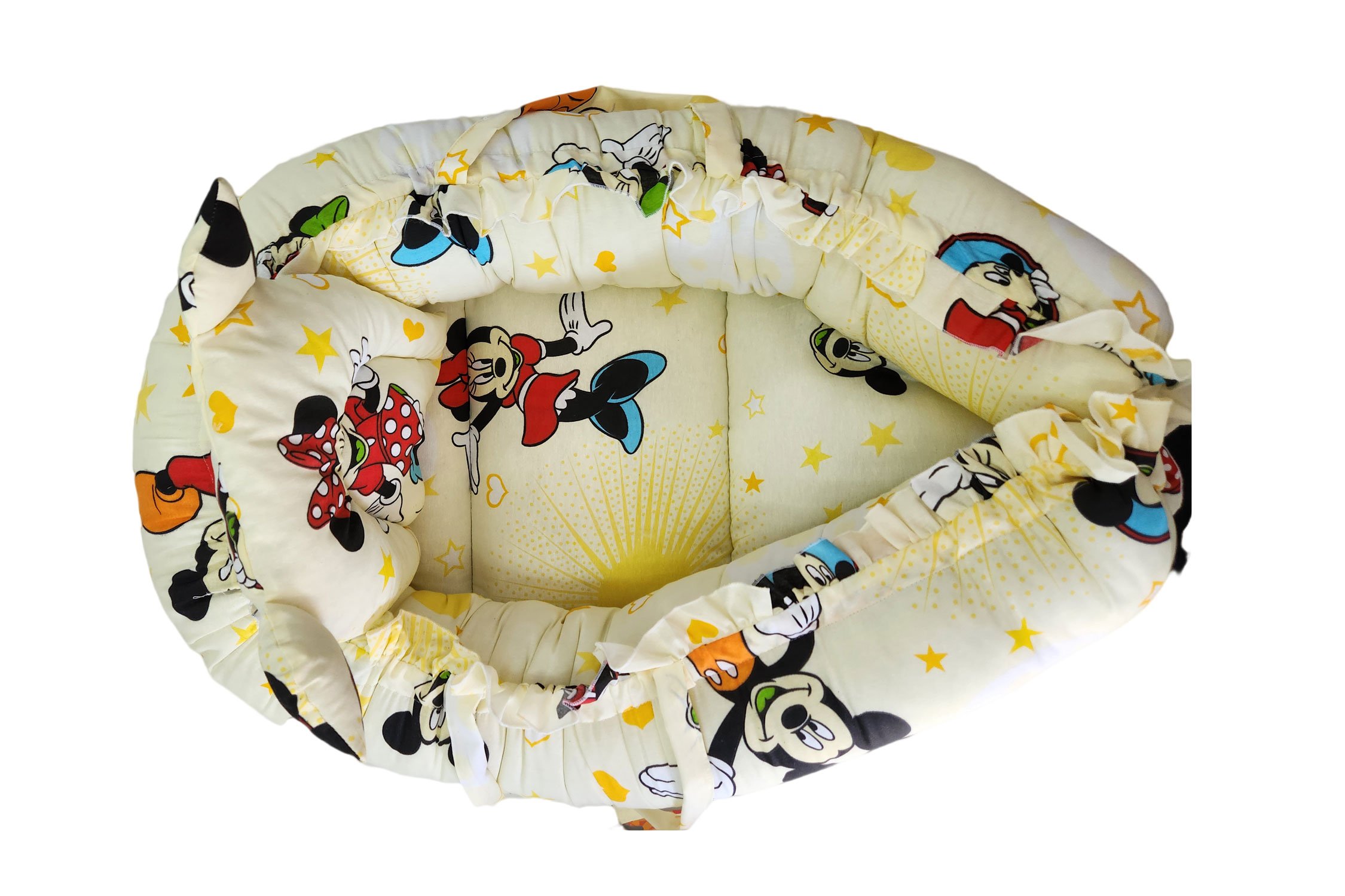 Baby Nest cu pernuta, model Mickey + Minnie din bumbac imprimat. Bebeluşul tău va dormi confortabil şi în siguranţă în acest baby nest. De asemenea, parintii il pot legana pe bebelus in baby nest. Cand acesta adoarme, pot pune baby nest-ul direct in pat. Astfel evitând ca bebelusul sa se trezeasca. Poate fi folosit şi ca suport de schimbat scutecele. Cosuletul tip baby nest, un loc confortabil si sigur din bumbac. Poate fi folosit inca de la nastere. Cosulet bebe, un real ajutor in etapele dezvoltarii bebelusului: -stat pe spate; – pe burtica; – primele exercitii de miscare. Baby nest necesar unui somn odihnitor mai ales cand sunteti plecati de acasa. Datorita acestui cosulet pentru bebe, puteti culca copilul oriunde aveti un spatiu. Copilasul poate fi mutat fara a fi trezit datorita beby nest-ului. Cosulet bebe reglabil, se poate restrange cat doriti cu ajutorul snurului integrat pe lateralele cosuletului. Lateralele ofera siguranta. Protejeaza in cazul rostogolirii. Este usor de pliat, incapand usor in orice bagaj. Astefel ii putei oferi bebelusului acelasi loc de somn. Pernuta este asortata. Baby Nest cu pernuta, model Mickey + Minnie, pentru un plus de protectie si confort. Detalii tehnice: doua fete din bumbac 100 %umplut cu vatelina si puf certficat OEKO Textantialergicdimensiuni exterioare: 90 x 50 cmdimensiunile pernuta: 30 x 20 cm