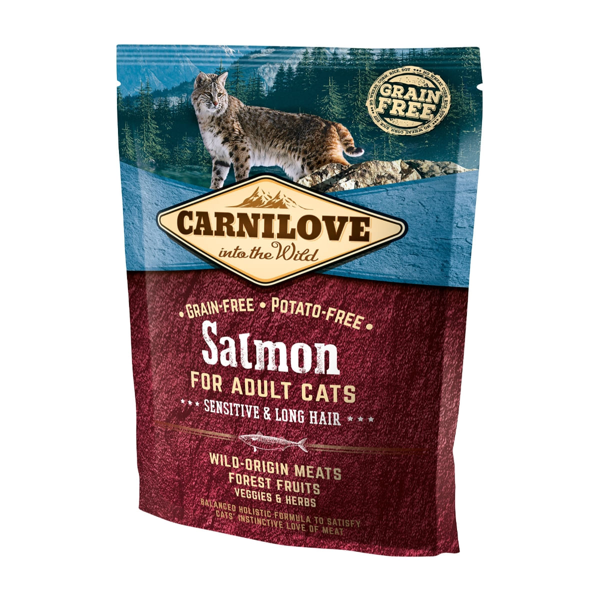 CARNILOVE Sensitive & Long Hair, Somon, hrană uscată fără cereale pisici, sensibilități digestive, piele și blană, 400g