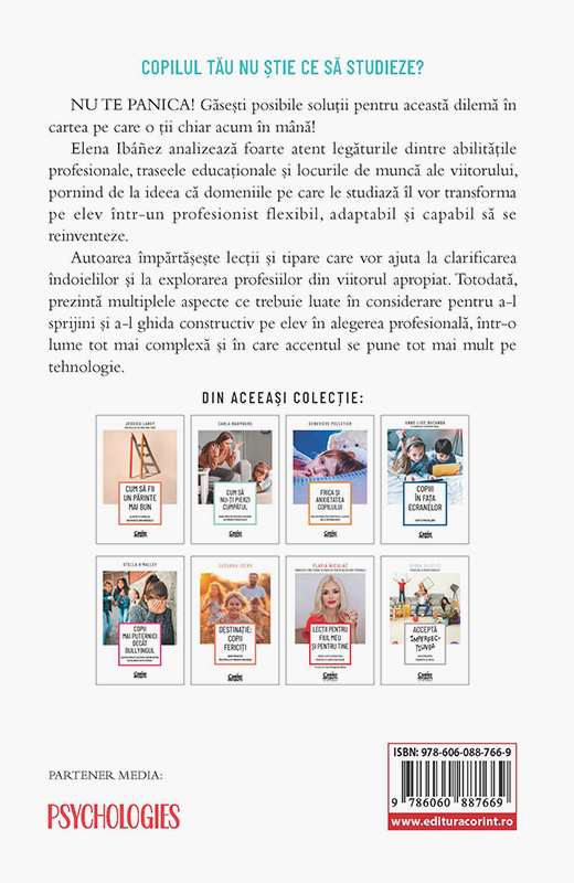 #html-body [data-pb-style=JD1WK0U]{justify-content:flex-start;display:flex;flex-direction:column;background-position:left top;background-size:cover;background-repeat:no-repeat;background-attachment:scroll}COPILUL TĂU NU ȘTIE CE SĂ STUDIEZE?nNU TE PANICA! Găsești posibile soluții pentru această dilemă în cartea pe care o ții chiar acum în mână! Elena Ibáñez analizează foarte atent legăturile dintre abilitățile profesionale, traseele educaționale și locurile de muncă ale viitorului, pornind de la ideea că domeniile pe care le studiază îl vor transforma pe elev într-un profesionist flexibil, adaptabil și capabil să se reinventeze. Autoarea împărtășește lecții și tipare care vor ajuta la clarificarea îndoielilor și la explorarea profesiilor din viitorul apropiat. Totodată, prezintă multiplele aspecte ce trebuie luate în considerare pentru a-l sprijini și a-l ghida constructiv pe elev în alegerea profesională, într-o lume tot mai complexă și în care accentul se pune tot mai mult pe tehnologie. „O analiză esențială și remarcabilă a noilor provocări cu care părinții și consilierii se confruntă atunci când încearcă să-i ajute pe copii în alegerea studiilor potrivite. O perspectivă inovatoare, care ia în considerare domeniile cu cea mai mare cerere în viitorul imediat, dar și interesele și scopurile care îi motivează pe tineri.” - LUIS MADRID, specialist în Educație Internațională acreditat de ONU „Cartea aceasta reprezintă un instrument extrem de util, care-l poate ajuta pe copilul tău să-și descopere vocația și potențialul, dar și să-și clarifice anumite îndoieli în ceea ce privește profesia pe care vrea s-o urmeze.” - LAURA ROJAS-MARCOS, doctor în Psihologie Clinică și Sănătate, terapeut, cercetător, scriitor și conferențiar