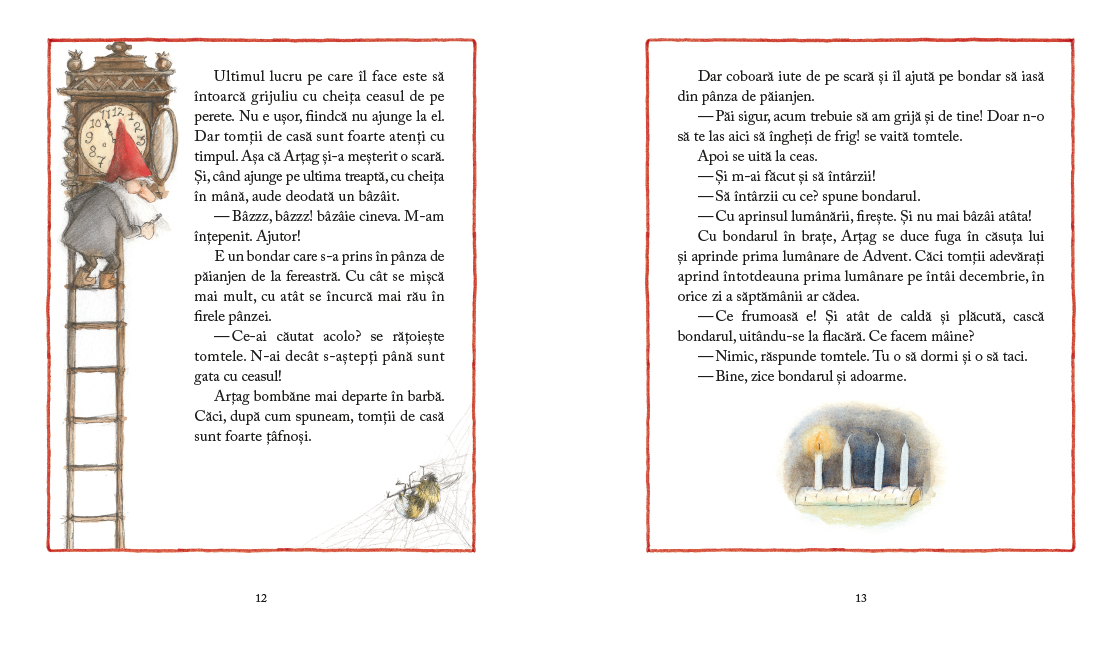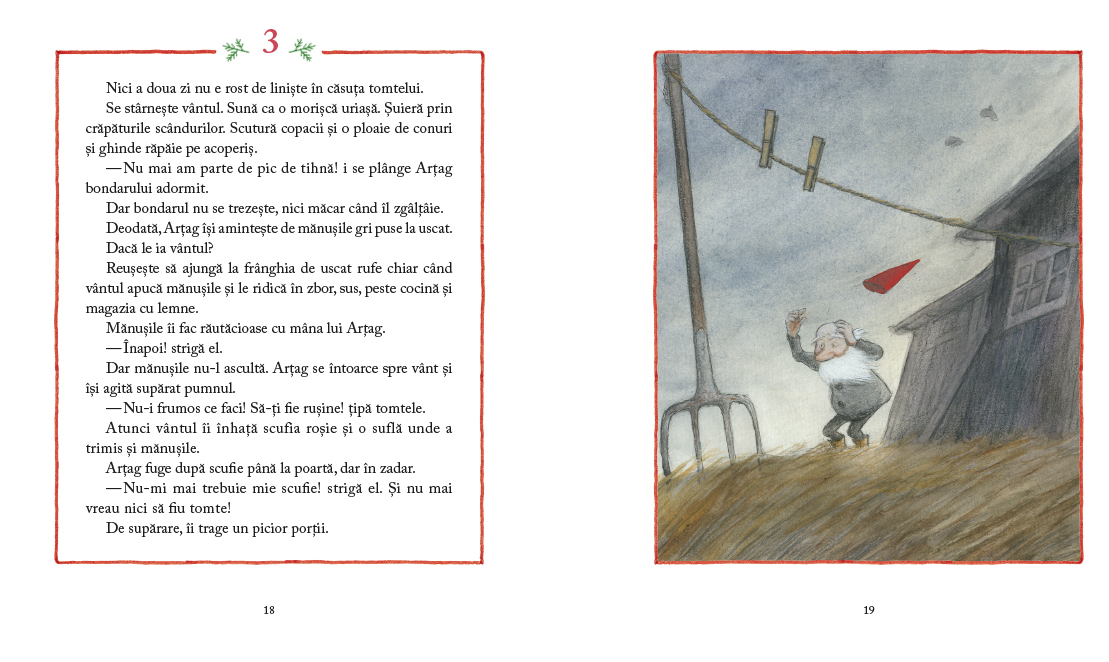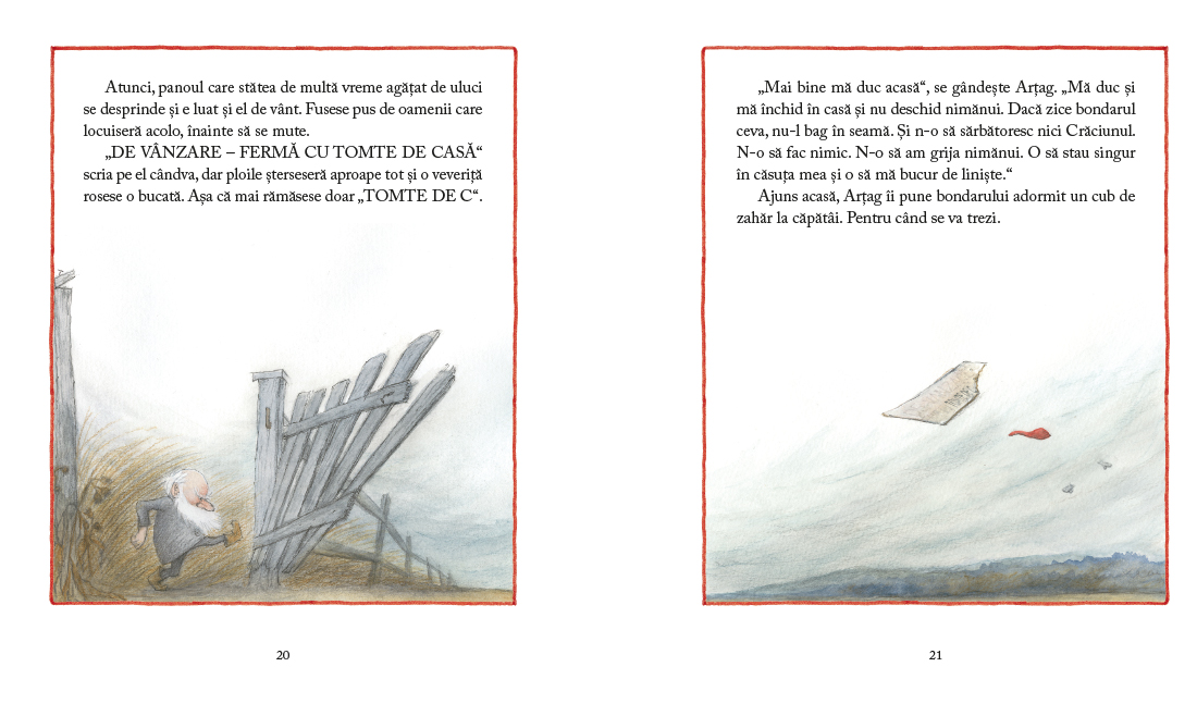 Personaj din folclorul scandinav, tomtele (in suedeza, tomte) este pazitorul credincios al oricarei gospodarii, in special al copiilor si animalelor. Nu e nici spiridus, nici elf, nici gnom. Multi se lauda ca l-au vazut, dar probabil i-au zarit doar scufia rosie sau barba alba pe la coltul casei ori au visat.Langa Padurea Mare, intr-o ferma parasita, locuieste tomtele Artag. Vremurile in care locul era plin de viata s-au dus de mult, dar el a ramas sa pazeasca gospodaria, cum face orice tomte. Nu mai sunt oameni care sa lucreze pamantul si sa ingrijeasca animalele, nici copii care sa alerge si sa se catare in copaci. Doar cu paianjenii sau bondarii rataciti mai poate schimba bietul tomte o vorba.Si pe deasupra, tocmai acum, cand vine iarna, isi pierde scufia cea rosie si manusile groase. Vantul cel neastamparat i le-a zburat de pe sfoara de rufe. De suparare, tomtele izbeste poarta si face sa cada scandura pe care oamenii scrisesera: „DE VANZARE – FERMA CU TOMTE DE CASA“. Pai da, de atunci au inceput necazurile. Aproape stearsa de ani si de ploi, pe scandura se mai vede doar „TOMTE DE C“.Vantul, care poate nu e chiar atat de neastamparat, duce scandura, scufia si manusile in calea unor iepurasi din padure. Sunt mititei si habar n-au ce-ar putea fi acele lucruri. Nici mama-iepure nu stie, nici tata-iepure. Doar doua stancute pricep ca pe scandura scrie ceva de un tomte. Mai stiu, din auzite, ca un tomte se lasa vazut doar de Craciun. Aha, acum e clar: trebuie sa fie toti pregatiti pentru ca de Craciun, in Padurea Mare, va sosi un mare domn tomte. Si, desi n-are niciun gand sa plece din casuta lui de la ferma, tomtele Artag ajunge totusi in Padurea Mare, ca prin minune. Poate ca Padurea Mare este noua lui casa, iar locuitorii ei noua sa familie de care trebuie sa aiba grija ca un tomte bun, intelept si de incredere. Si putin morocanos, cand isi aduce aminte.Povestile din „Padurea Mare” alcatuiesc o foarte populara serie de romane ilustrate pentru copii creata de Ulf Stark. „Craciun in Padurea Mare” este prima carte din serie.ULF STARK (1944–2017) a fost poet, scriitor si scenarist si unul dintre cei mai importanti autori suedezi de carti pentru copii. In textele sale, lumea este vazuta din perspectiva unui copil, intr-un mod foarte autentic, fidel si subtil. Fie ca se ocupa de lucruri marunte, fie ca scrie despre teme grave, cum ar fi moartea, Ulf Stark este un maestru al atragerii cititorului in poveste si al dezvaluirii unor sensuri profunde in intamplarile aparent banale, de zi cu zi, din viata unui copil. A scris aproape 100 de carti, traduse in 30 de limbi, si multe dintre ele au fost transformate in filme si piese de teatru. In 1993, a primit Premiul Memorial Astrid Lindgren, in 2017 a fost rasplatit cu Premiul pentru Literatura pentru Copii si Tineri al Consiliului Nordic, iar in 2018 a fost nominalizat postum la Premiul H.C. Andersen.EVA ERIKSSON (n. 1949) este...