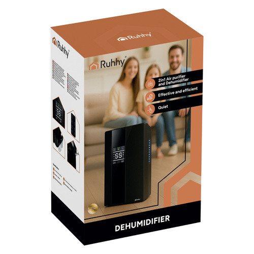 Dezumidificator si purificator de aer, 90W, panoul tactil, telecomanda, temporizator, 2000 ml, functie SLEEP Dezumidificatorul si purificatorul de aer 2 in 1, cu o putere de 90 W, este solutia ideala pentru mentinerea unui climat interior sanatos si confortabil. Aparatul elimina eficient excesul de umiditate din aer, prevenind aparitia mucegaiului, a bacteriilor si a mirosurilor neplacute, fiind perfect pentru utilizare in baie, bucatarie, subsol sau spalatorie. Cu un rezervor de apa de 2000 ml si o capacitate de dezumidificare de pana la 650 ml/zi, dispozitivul este potrivit pentru incaperi de pana la 30 mp. Tehnologia de dezumidificare pe baza de modul Peltier asigura un consum redus de energie si o functionare silentioasa, cu un nivel de zgomot intre 25 si 30 dB. Functia de purificare a aerului, realizata cu ajutorul unei lampi UV, contribuie la eliminarea bacteriilor si a particulelor nocive, imbunatatind calitatea aerului respirat. Panoul tactil si telecomanda ofera o utilizare intuitiva, iar functia de setare inteligenta a umiditatii intre 40% si 70% permite personalizarea mediului interior dupa preferinte. Aparatul este dotat cu functie de oprire automata, indicator de umplere a rezervorului si posibilitatea de conectare a unui furtun pentru scurgere continua. Cronometrul reglabil intre 1 si 24 de ore, impreuna cu functia SLEEP, care opreste iluminarea de fundal pe timp de noapte, asigura un plus de confort. Functia de dezghetare protejeaza elementele interne, prelungind durata de viata a aparatului. Dispozitivul este echipat cu higrometru, termometru si umidistat incorporati, oferind un control precis asupra mediului ambiant. Designul compact este completat de un maner de transport integrat si picioare antiderapante pentru stabilitate. Recipientul pentru apa este detasabil si usor de golit, iar pachetul include un serviciu complet de asistenta gratuita dupa achizitie. Acest dezumidificator si purificator modern respecta standardele europene si garanteaza un mediu interior curat, sanatos si bine echilibrat. Specificatii: -dezumidificator si purificator 2 in 1; -conform standardelor europene; -eliminarea umiditatii din aerul interior; -pentru baie, bucatarie, subsol, spalatorie; -panou tactil; -functie inteligenta de setare a umiditatii 40% - 70%; -tehnologie de dezumidificare: modul Peltier; -oprire automata; -functia „Purificare aer” - purificarea aerului cu o lampa UV; -functia „Dezghetare” - dezghetarea automata a elementului intern al dezumidificatorului; -functia SLEEP - dispozitivul opreste iluminarea de fundal a ecranului pentru a nu orbi noaptea; -cronometru 1 - 24 de ore; -higrometru incorporat; -termometru incorporat; -umidistat incorporat; -posibilitatea de uscare continua folosind un furtun de scurgere; -maner de transport integrat; -picioare antiderapante; -recipient detasabil pentru apa; -indicator de umplere a rezervorului; -telecomanda; -functionare silentioasa: 25 - 30 dB; -temperatura ambientala optima: 15 - 32 °C; -eficienta: 650 ml pe zi; -suprafata: 30 de metri patrati; -capacitate rezervor de apa: 2000 ml; -putere: 90 W; -tensiune: CA 220 - 240 V / 50 Hz; -dimensiuni: 25 x 14 x 37,5 cm; -greutate: 2,124 kg; -greutate ambalata: 2,533 kg; -material: ABS; -culoare: negru. Inclus in set: dezumidificator de aer, cablu de alimentare, furtun de scurgere a apei, telecomanda, ambalaj colorat, insertii de protectie din polistiren, cutie de transport maro.