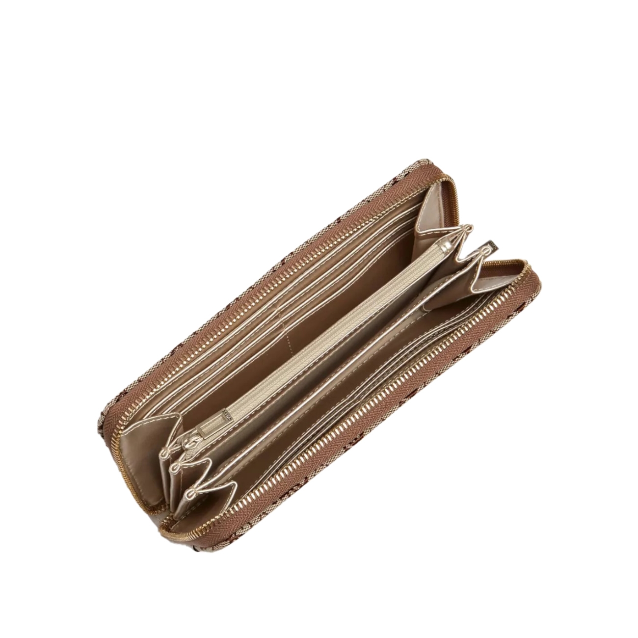 Guess și-a început povestea în 1981 în dorința de a crea blugi unisex. De atunci brand-ul a evoluat și a devenit unul dintre cele mai cunoscute nume din lume, oferind o gamă largă de articole vestimentare, bijuterii, genți, încălțări și accesorii. Portofelul Frankie Large Zip Around – o declarație de stil în sine! Acest accesoriu impresionează din primul moment prin combinația sa rafinată: material bej cu imprimeu integral 4G în tonuri de maro, accente elegante din piele ecologică crem, decorate cu ținte discrete. Interiorul este gândit pentru organizare eficientă – cu multiple compartimente pentru carduri, buzunare pentru documente și spații dedicate pentru bonuri, bancnote sau monede.