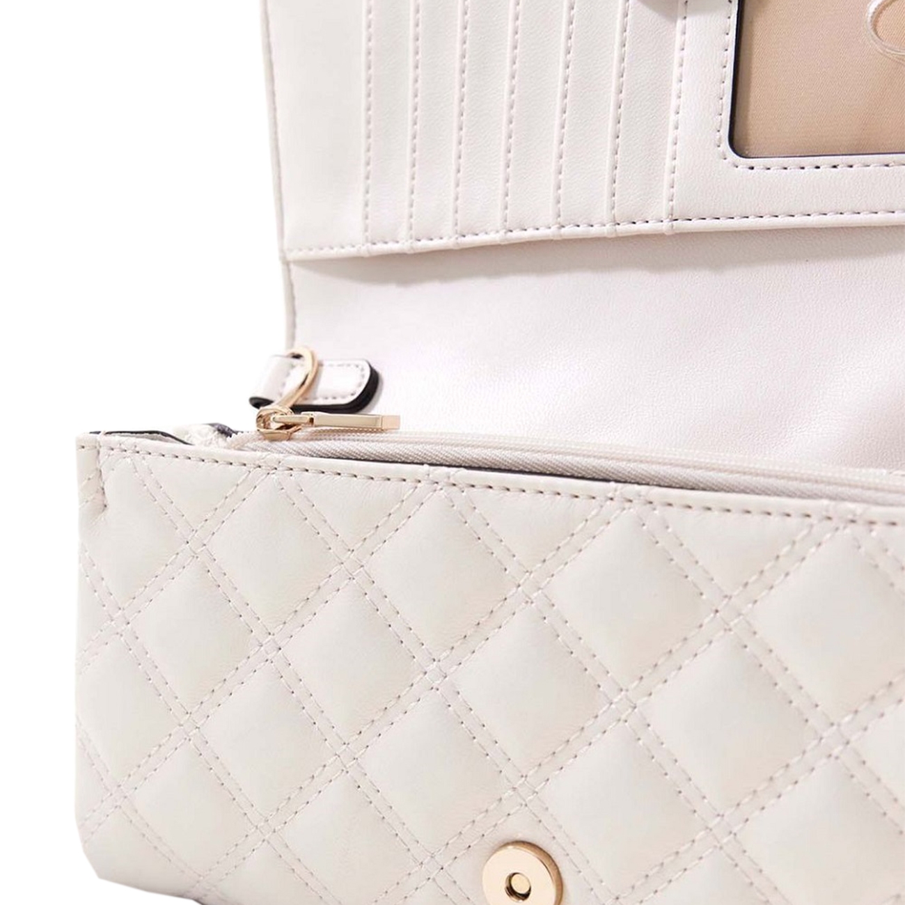 Geantă crossover Guess, confecționată integral din poliuretan, cu design matlasat în carouri și logo metalic triunghiular aplicat pe partea frontală. Dispune de un compartiment principal spațios, ideal pentru obiectele esențiale de zi cu zi, oferind un plus de eleganță și funcționalitate ținutelor casual sau de seară.
