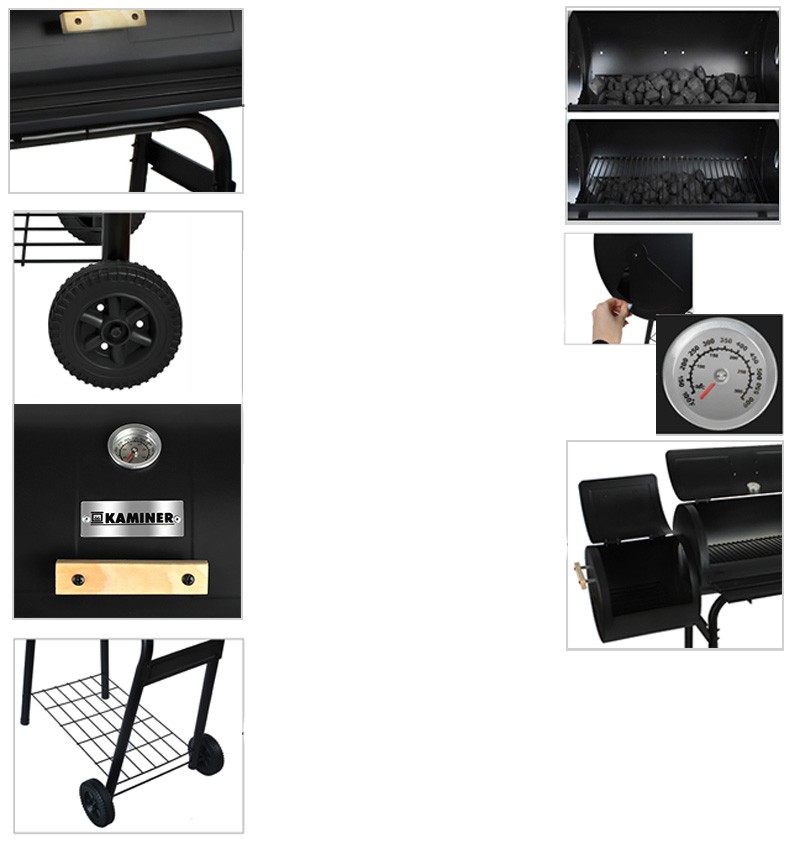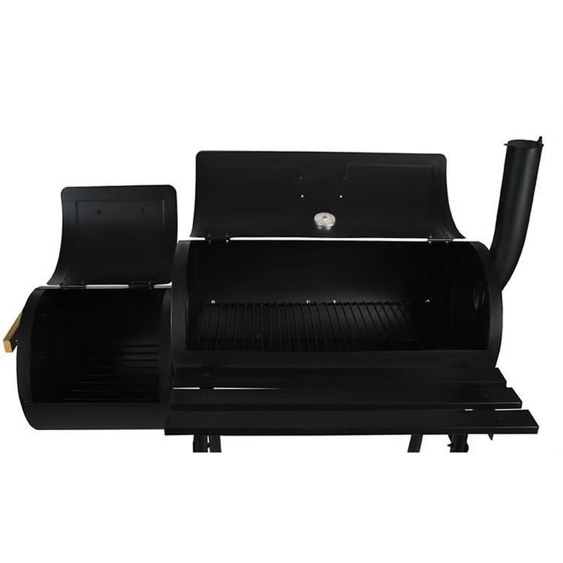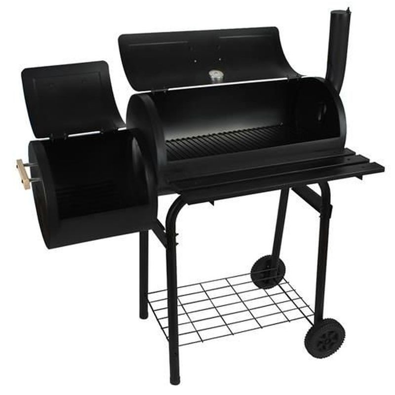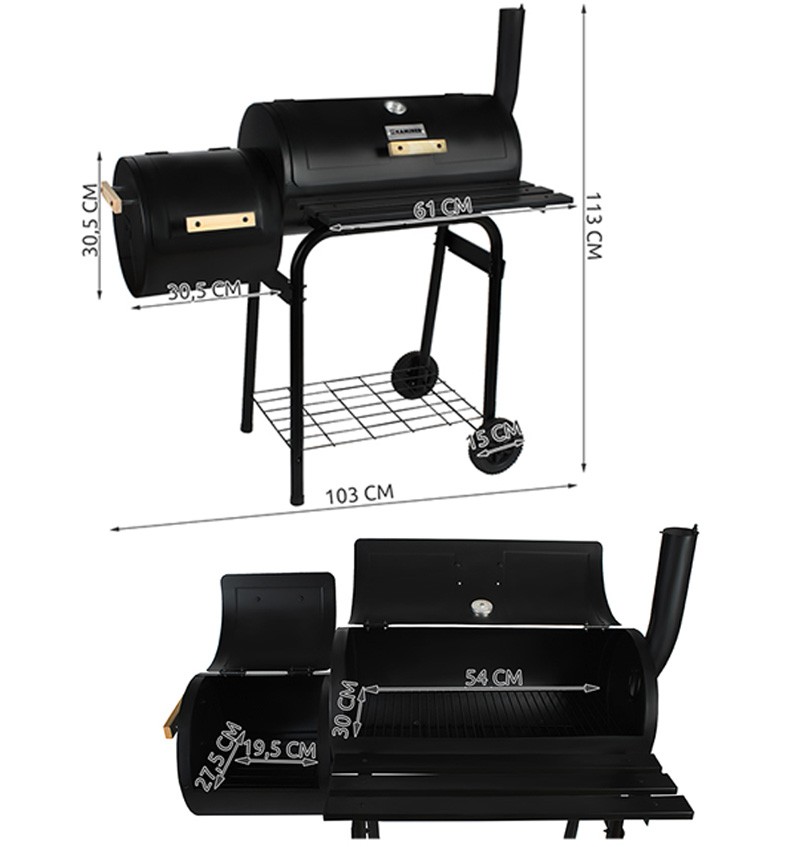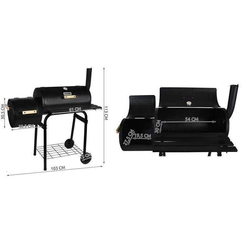 Gratar BBQ si Smokern, termometru, 2 compartimente, 113x103 cm Acest gratar este alegerea ideala pentru a gati o carne gustoasa si bine facuta la dumneavoastra acasa sau pentru afumarea carnurilor. Puteti amplasa gratarul pe terasa, in curte sau gradina fiind usor de transportat datorita rotilor de care dispune. Gratarul este prevazut cu un suport pentru depozitarea ustensilelor necesare si un suport tip plasa in partea inferioara pentru a depozita carbunii. Termometrul montat pe capacul gratarului va permite sa controlati temperatura de gatire pentru a obtine o carne bine gatita si plina de gust. Caracteristici: - gratar BBQ si Smokern; - dispune de termometru pentru a controla temperatura; - puteti regla temperatura dorita pentru gatire; - gratarul dispune de roti care faciliteaza mutarea acestuia; - cele 2 compartimente sunt prevazute cu carcasa metalica; - gratarul este prevazut cu un horn pentru evacuarea aerului; - afumatoarea este prevazuta cu un orificiu pentru ventilare; - manerele gratarului sunt confectionate din lemn; - grilaj detasabil si usor de curatat; - dispune de suport pentru asezarea vaselor sau ustensilelor; - suport pentru depozitarea carbunelui; - puteti obtine o carne bine gatita si foarte gustoasa; - puteti afuma carnea; - confectionat din metal; - rezistent la temperaturi ridicate; - potrivit pentru terasa, gradina sau curte; - dimensiuni gratar 113x103 cm; - dimensiuni afumatoare 30.5x30.5 cm; - culoare negru.