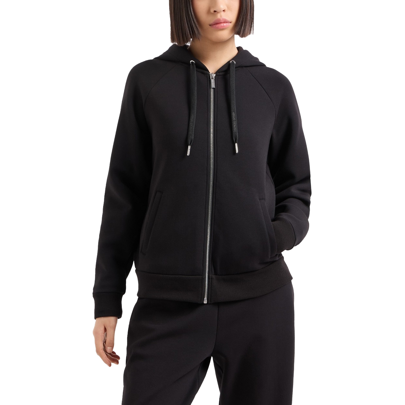 Hanoracul pentru femei Armani Exchange, de culoare neagră, este realizat din poliester de calitate, oferind confort și rezistență. Are glugă ajustabilă cu șnur, fermoar frontal și buzunare practice, fiind o piesă esențială și versatilă pentru ținutele casual sau sport.