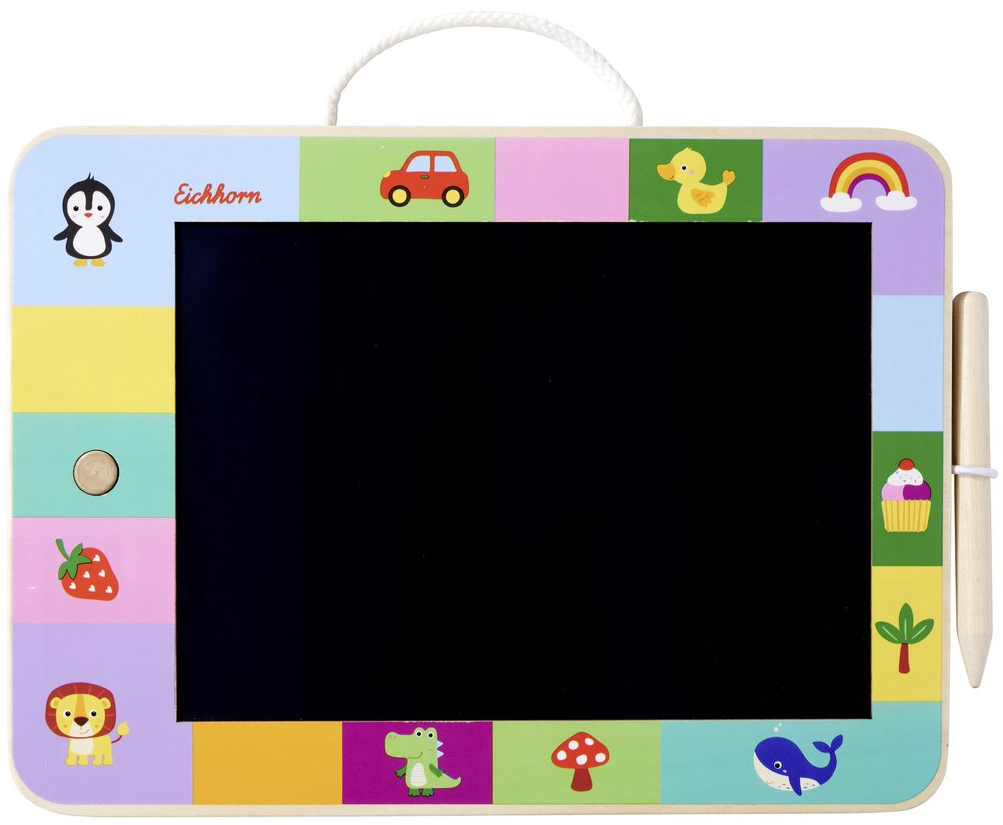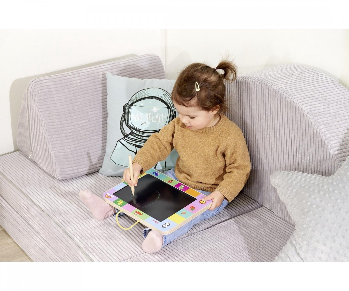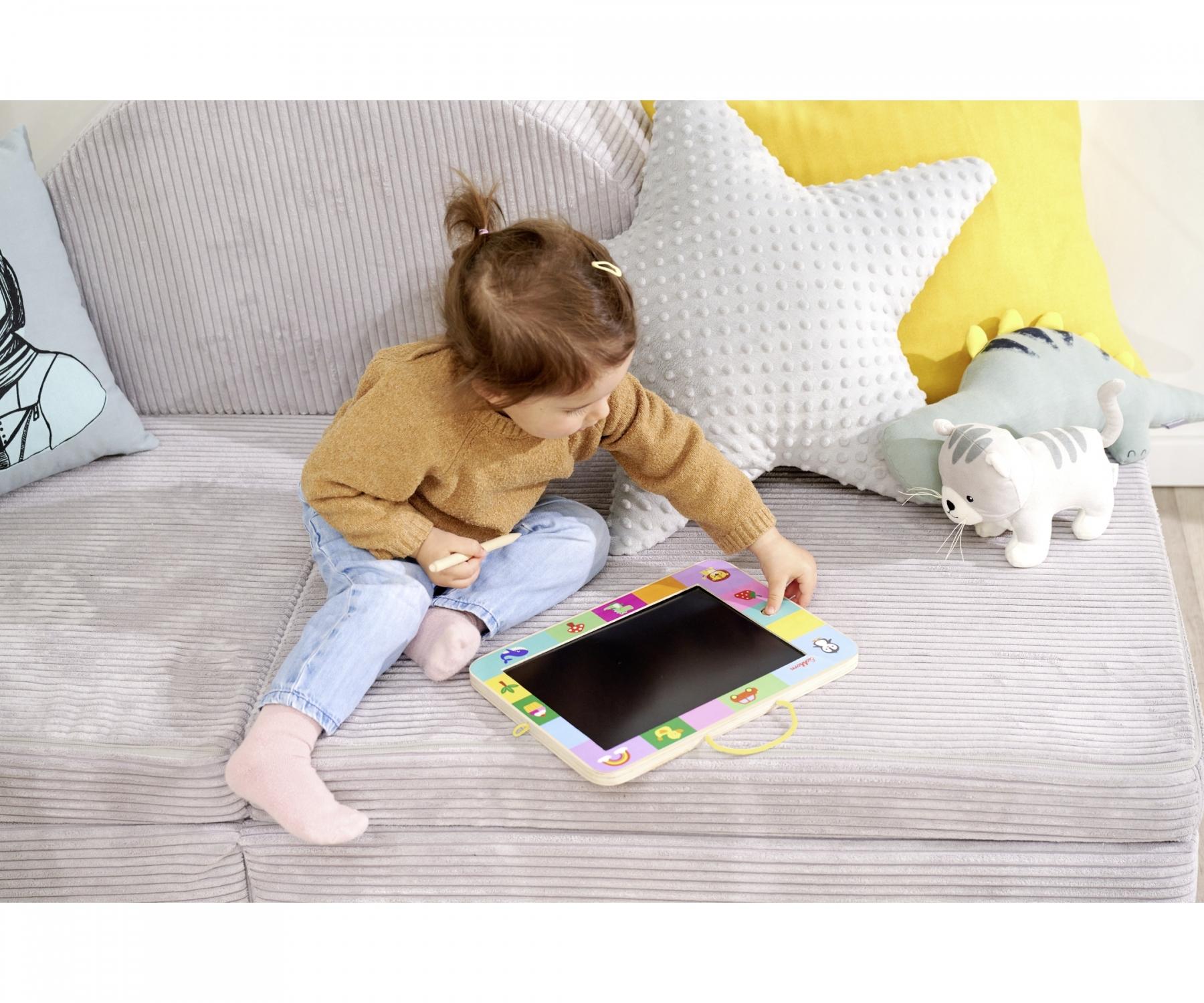 Cu tabla de desen de la Eichhorn, creata cu grija special pentru micii artisti de la 3 ani in sus, copiii isi pot lasa libera imaginatia si pot da viata propriilor idei. Suprafata practica de desen, de 22,5 x 16 cm, ofera suficient spatiu pentru idei marete si mici opere de arta. Culorile vii si simbolurile variate de pe tabla stimuleaza fantezia celor mici.Creionul din lemn integrat este mereu la indemana, iar manerul practic transforma tabla intr-un companion perfect – fie acasa, fie in deplasare. Prin apasarea butonului din lemn, desenul colorat dispare in mod magic, permitand copilului sa inceapa din nou.Ofera ore intregi de distractie si invatare creativa! Tabla de desen este livrata cu doua baterii LR03 de 1,5V incluse.