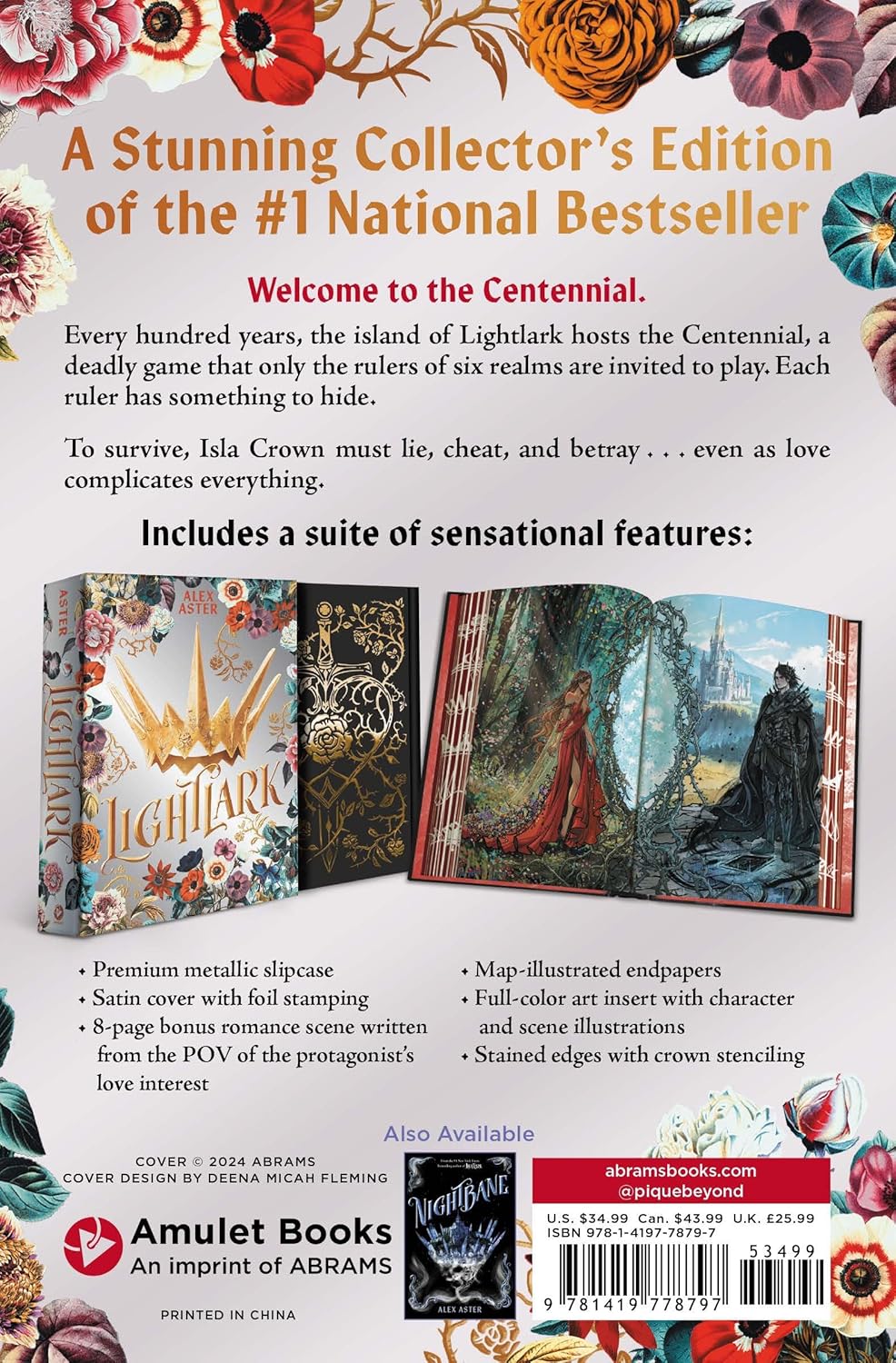 This stunning collectors edition of the #1 national bestseller and first book in the beloved Lightlark Saga from award-winning author Alex Aster includes a suite of sensational features:Premium metallic slipcaseSatin cover with foil stampingFull-color art insert with character and scene illustrations8-page bonus romance scene written in the POV of Isla’s love interestMap-illustrated endpapersStained edges with crown stencilingWelcome to the Centennial. Every 100 years, the island of Lightlark appears to host the Centennial, a deadly game that only the rulers of six realms are invited to play. The invitation is a summons―a call to embrace victory and ruin, baubles and blood.The Centennial offers the six rulers one final chance to break the curses that have plagued their realms for centuries. Each ruler has something to hide. Each realm’s curse is uniquely wicked. To destroy the curses, one ruler must die.To survive, Isla Crown must lie, cheat, and betray . . . even as love complicates everything.