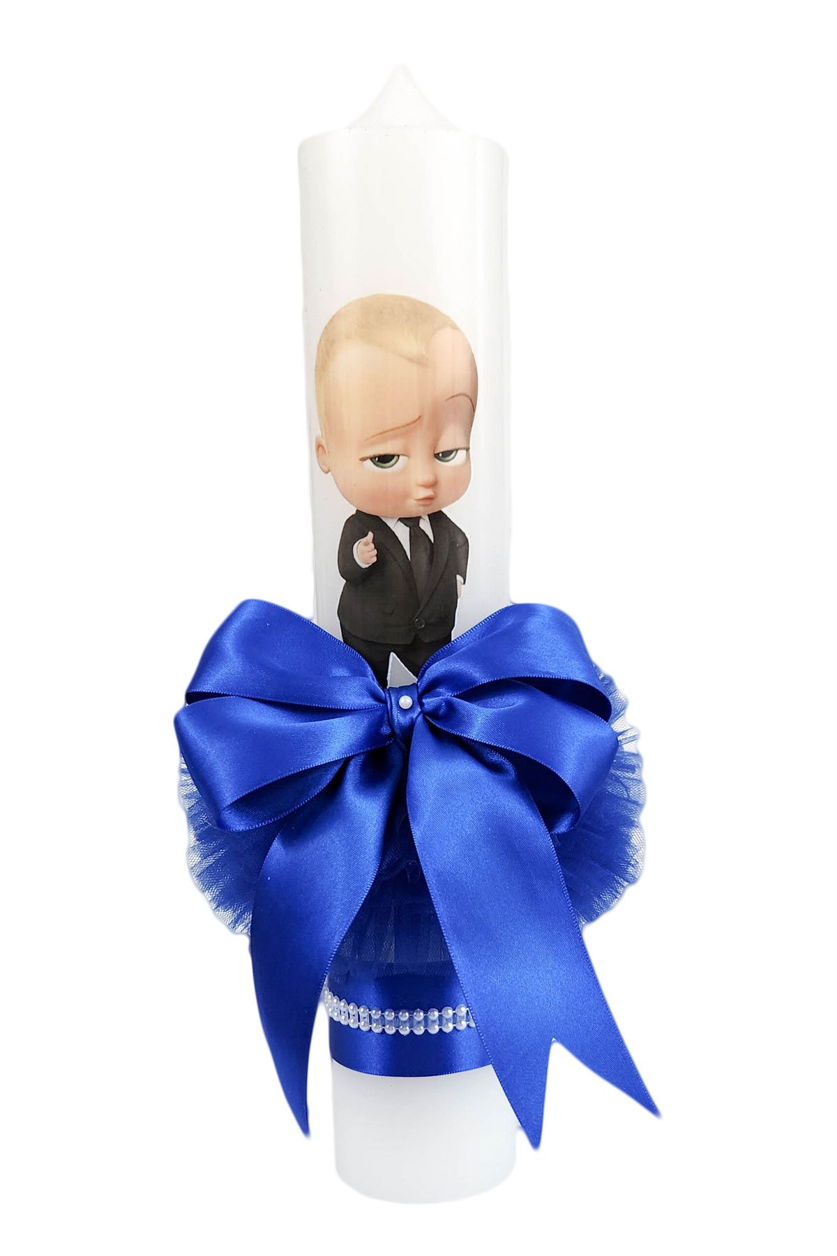 Lumanare botez, model Baby Boss, glob culoare albastra, creata manual. Lumanare botez este din parafina alba cu o lungime de 35 cm si un diametru de 6 cm. Lumanarile sunt intarite pentru rezistenta la transport.Comanda minima 3 buc (pot fi 3 buc diferite)