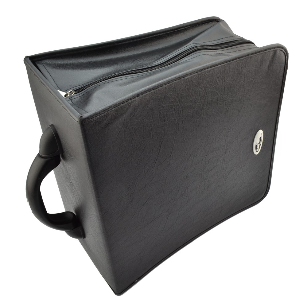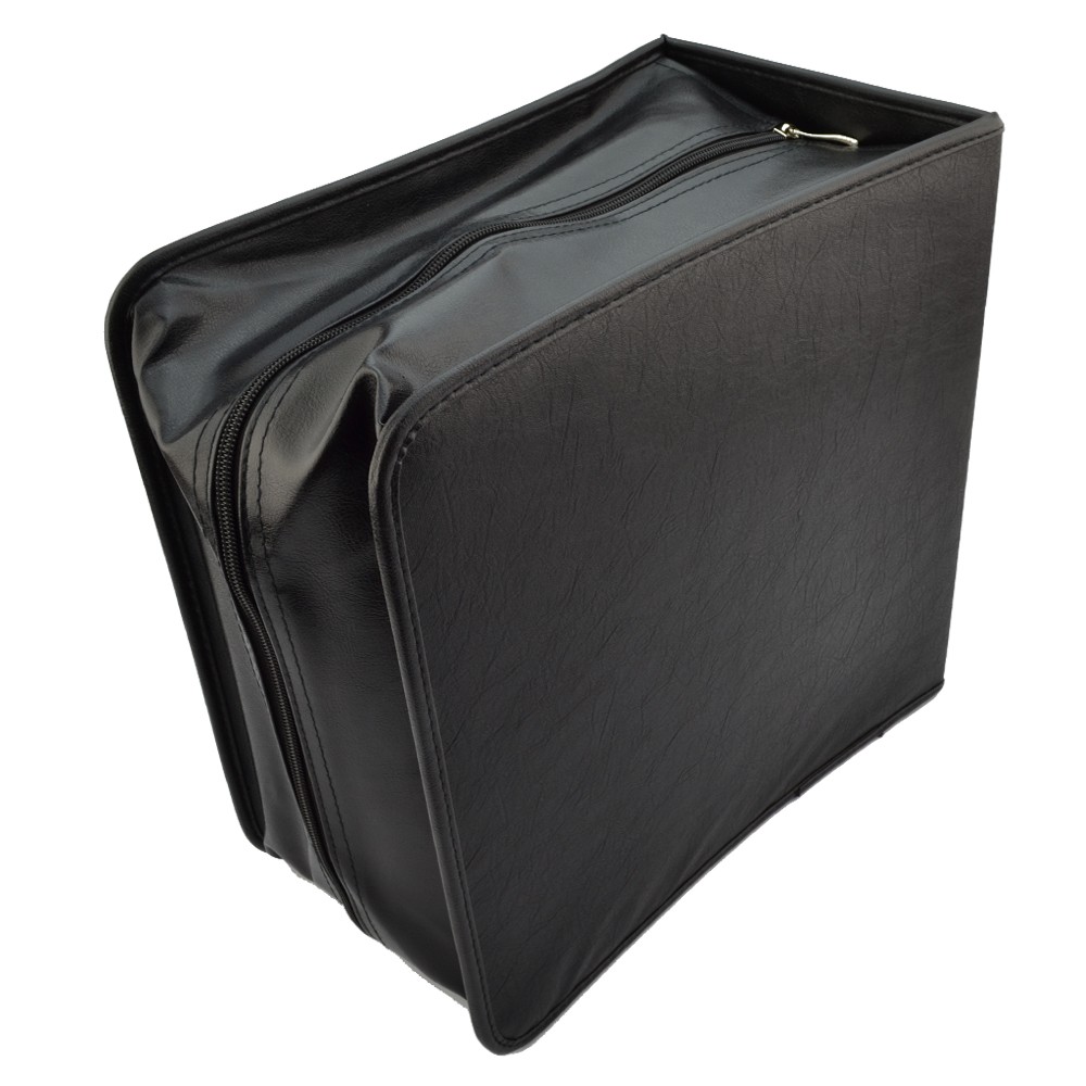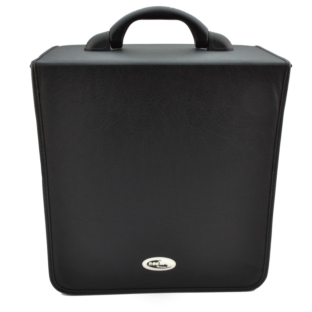 Mapa protectie din piele ecologica pentru 500 DVD, CD, Blu ray Cu un design extrem de moder si fashion mapa tip geanta va mentine in siguranta discurile de tip CD, DVD sau chiar Blu ray. Aceasta are prevazute 500 de buzunare ce protejeaza si mentin bine ordonate discurile, fiind astfel usor sa va ordonati si pastrati informatiile electronice astfel stocate. Confectionata din piele ecologica aceasta se inchide cu fermoar, manerul fiind extrem de practic si comod pentru transport. Caracteristici: - dimensiuni 33 x 31 x 18cm; - material piele ecologica; - capacitate 500 discuri; - culoare negru.