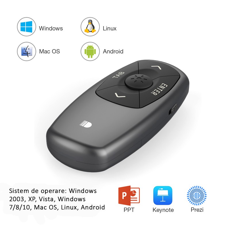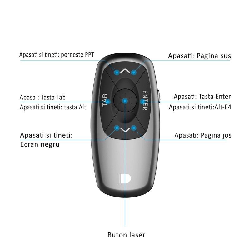 Laser de prezentare Wireless, distanta control 100 m, 5 butoane, reincarcabil Mini laser pointer (laser presenter) Wireless reincarcabil care dispune de 5 butoane dispuse ergonomic pentru o functionare confortabila. Dispozitivul are un design compact, usor de utilizat si de transportat oriunde aveti nevoie de un astfel de accesoriu de prezentare. Pointer-ul este echipat cu un micro-cip de calitate superioara, control fara fir pana la 100 de metri distanta si control 360 de grade, care opereaza pe o frecventa RF (radio) de 2.4 GHz. Atentie! Nu este necesar sa instalati nici un driver, doar Plug & Play! Caracteristici: - laser pointer Wireless; - interfata USB 2.0; - tehnologie fara fir: frecventa radio 2.4 GHz; - distanta de control > 100 m; - tip laser clasa II; - puterea maxima de iesire laser < 1 mW; - distanta laser > 200 m; - lungime de unda 650 nm; - 1 x baterie incorporata reincarcabila Polymer Lithium; - capacitate baterie 240 mAh; - tensiune de lucru 3.6V - 4.2V; - 2 x butoane Page Up (pagina sus) / Page Down (pagina jos), dispuse frontal; - 1 x intrerupator standard ON/OFF; - 1 x buton Pointer, dispus central in partea din fata; - 2 x butoane TAB + ENTER; - potrivit pentru diverse prezentari, intalniri, training-uri, sedinte; - reincarcabil, cablul de alimentare USB inclus; - lungimea cablului USB este de 60 cm; - nu este necesar sa instalati nici un driver, doar Plug & Play; - forma compacta, portabil, usor de utilizat si de transportat; - confectionat integral din material ABS rigid; - dimensiuni pointer 78x37x18 mm; - greutate 26 g; - culoare pointer gri inchis. Specificatii receiver USB: - sisteme de operare compatibile: Windows 7/8/10, Mac OS, Linux, Android; - versiune USB: 1.1/2.0/3.0; - tensiune de lucru 4.5V - 5.5V DC; - dimensiuni 20x15x6 mm; - greutate 2 gr. Pachetul livrat contine: - 1 x laser pointer Wireless (receiver USB); - 1 x cablu de alimentare USB; - 1 x manual de instructiuni.