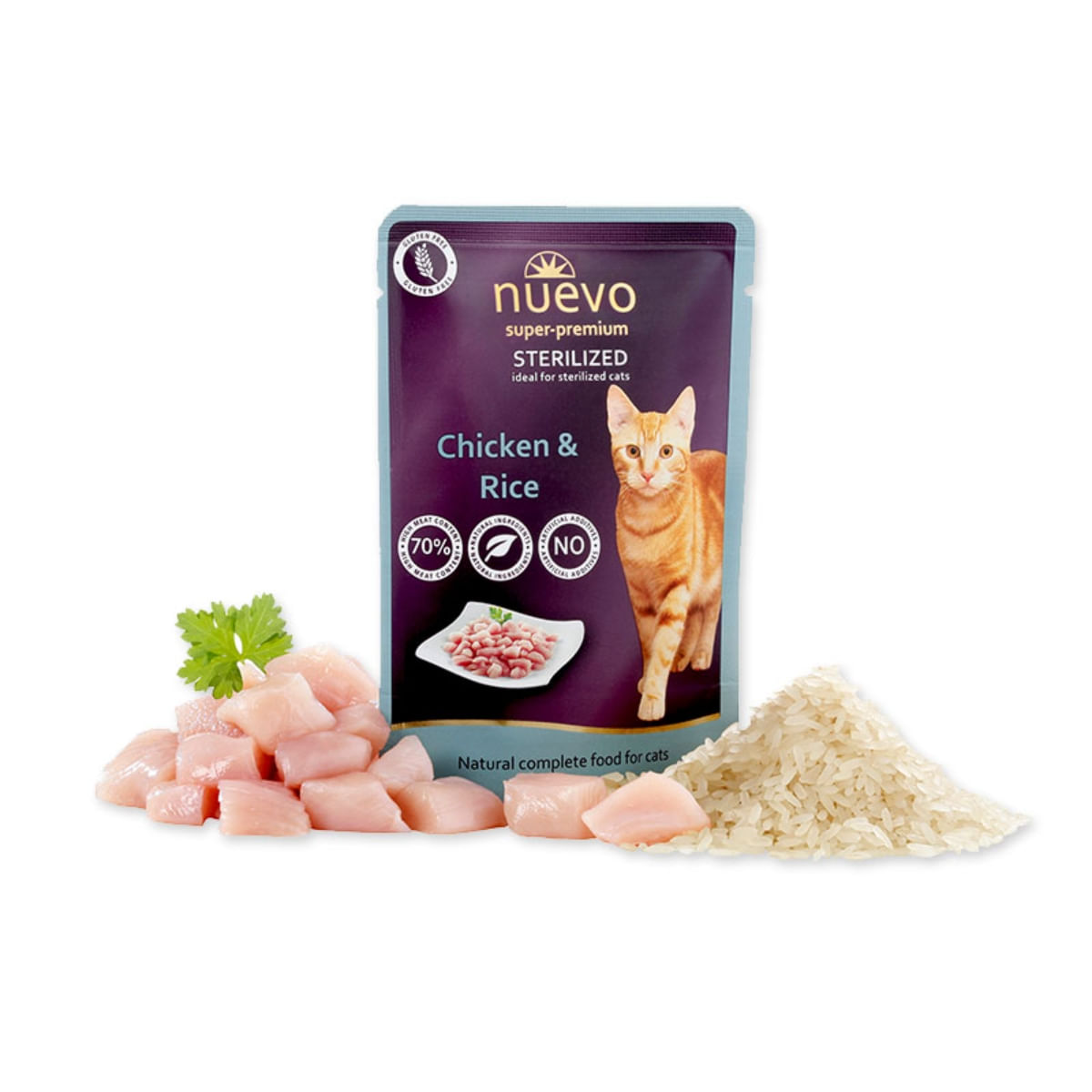 NUEVO Sterilized, Pui și Orez, hrană umedă pisici sterilizate, (pate) NUEVO Sterilized, Pui și Orez, plic hrană umedă pisici sterilizate, (pate), 85g