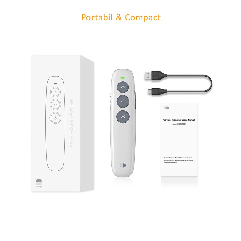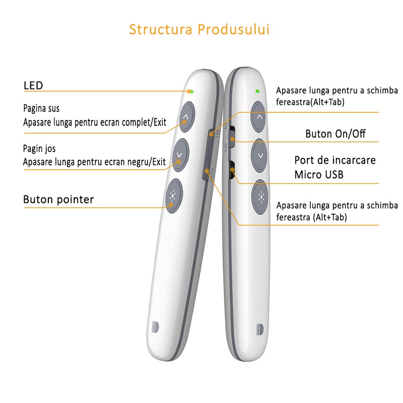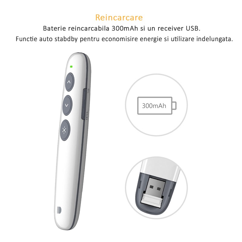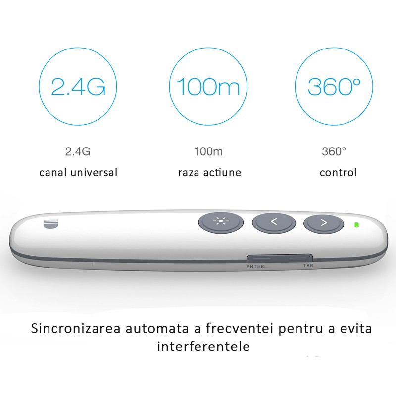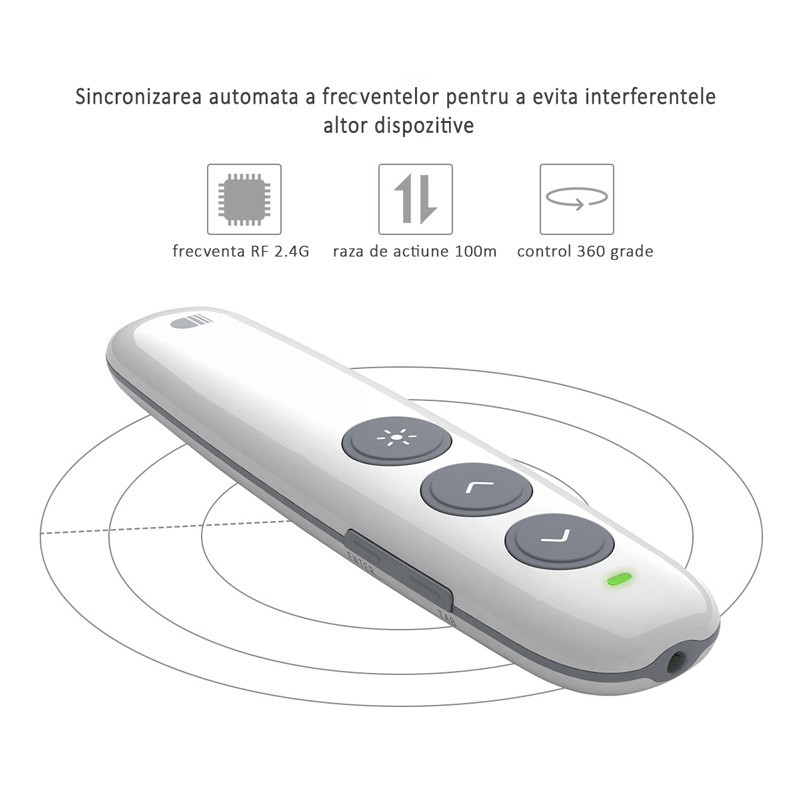 Presenter laser wireless, telecomanda prezentari indicator rosu, USB, raza 100 m Laser pointer-ul Wireless cu receptor USB este alegerea perfecta pentru prezentari, intalniri, training-uri sau conferinte. Dispozitivul este prevazut cu un indicator LED cu lumina verde/rosie si are un design compact, fiind practic si usor de transportat pentru a fi mereu la indemna dumneavoastra. Pentru utilizarea laser pointer-ului este suficient sa conectati receptorul USB 2.0 (inclus) la un computer si puteti controla cu usurinta prezentarile pana la 100 de metri distanta. Nu este necesar sa instalati nici un driver, doar Plug & Play. Caracteristici: - telecomanda Wireless tip laser pointer; - interfata USB 2.0; - compatibil versiune USB 1.1 / 2.0 / 3.0; - sisteme de operare compatibile Windows 7/8/10, Mac OS, Linux, Android; - tehnologie fara fir frecventa radio 2.4 GHz; - control 360 de grade; - distanta de control > 100 m, clasa ; - tip laser clasa II; - puterea maxima de iesire laser < 1 mW; - distanta laser > 200 m; - lungime de unda 650 nm; - baterie incorporata reincarcabila Polymer Lithium 300mAh; - tensiune de lucru 3.6V - 4.2V tensiune de lucru USB DC 4.5V - 5.5V;; - 1 x LED indicator de culoare verde/rosu; - 2 x butoane Page Up (pagina sus) / Page Down (pagina jos), dispuse frontal; - 1 x comutator standard ON/OFF; - 1 x buton Pointer, dispus frontal; - 2 x taste Tab + Enter, dispuse in partea dreapta-lateral; - potrivita pentru prezentari, intalniri, training-uri, sedinte sau conferinte; - se incarca cu ajutorul cablului de alimentare USB (inclus) avand lungimea de 60 cm; - nu este necesar sa instalati nici un driver, doar Plug & Play; - forma compacta, portabil, usor de utilizat; - confectionata integral din materiale de inalta calitate, rezistente la uzura; - dimensiuni telecomanda 125x30x15 mm; - greutate 32 g; - culoare telecomanda alb. Pachetul livrat contine: - 1 x laser pointer Wireless (receiver USB); - 1 x cablu de alimentare USB; - 1 x manual de instructiuni.
