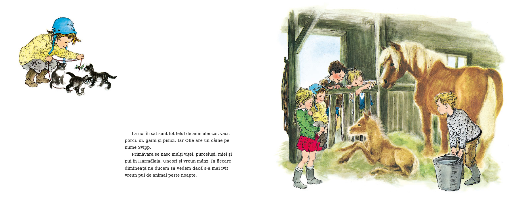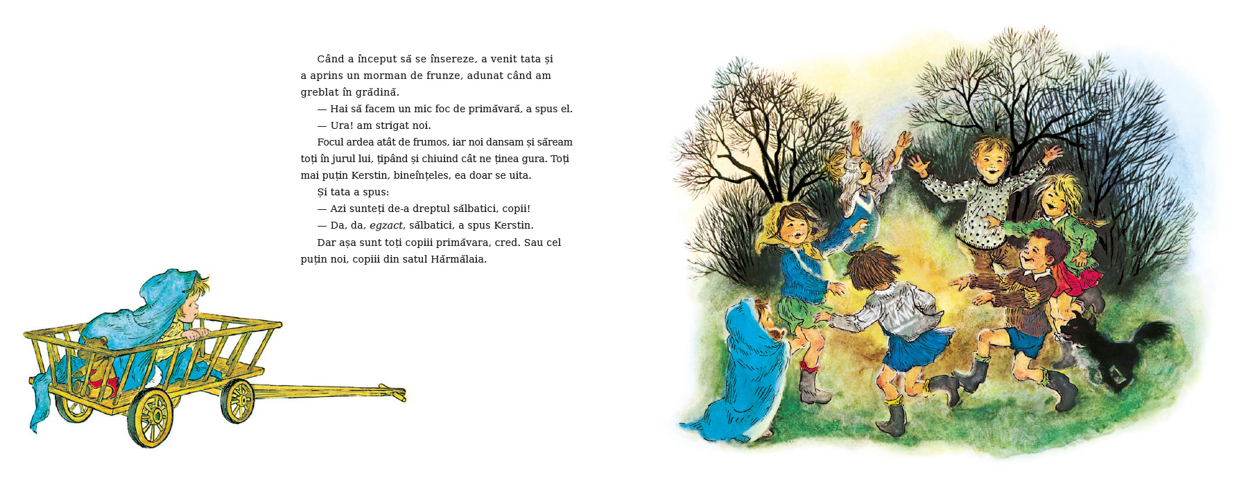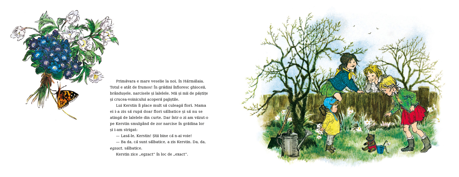 In satul Harmalaia, primavara este o sarbatoare pe care copiii o traiesc din plin. Hoinaresc pe pajisti si prin gradini, topaie prin balti, se catara pe garduri sau pe magazia de lemne, fugaresc pisica, aluneca prin noroiul de pe ulite, cad (din intamplare) in paraias — oriunde ii poarta pasii, e ceva interesant de facut sau de vazut. La fel ca pentru mieii fara astampar de pe pasune sau manzul abia nascut, si pentru copiii din satul Harmalaia lumea e noua, proaspata si luminoasa. Va fi un an bun.De ud, e ud peste tot la noi in sat primavara. Uneori, cand ne intoarcem de la scoala, drumul e doar o mare mocirla. Cizmele de cauciuc fac fleosc-fleosc cand calcam in baltile care ne ies in cale. Iar cateodata alunecam in sant si cizmele ni se umplu cu apa. Alteori mergem pe garduri. Intr-o zi, ne-a vazut o matusa si ne-a intrebat daca mergem asa ca sa nu ne udam la picioare. Nici prin cap nu i-ar fi dat ca facem asta doar fiindca e distractiv. „Cine a zis ca-i musai sa mergem doar pe drum?“ a spus Lasse apoi. „Probabil vreun om mare“, a zis Bosse. „Asa cred si eu“, a raspuns Lasse. Astrid Lindgren (1907–2002) este cea mai cunoscuta scriitoare suedeza de literatura pentru copii. Copilaria petrecuta la ferma parintilor, alaturi de fratele sau si de cele doua surori, dragostea cu care a fost inconjurata, aventurile copilaresti si jocurile au fost sursa inepuizabila de inspiratie pentru povestile si personajele sale. Astrid Lindgren a crescut printre carti si a fost toata viata o mare sustinatoare a lecturii in randul copiilor. „O copilarie fara carti nu este copilarie. E ca si cum ai fi izgonit din locul fermecat in care poti gasi bucuria in stare pura.” Cartile sale au fost traduse in zeci de limbi si au facut obiectul multor ecranizari. Dupa Fratii Grimm si Hans Christian Andersen, Astrid Lindgren este cel mai tradus autor de literatura pentru copii.Ilon Wikland (n. 1930) este o ilustratoare de origine estoniana care a ajuns in Suedia ca refugiat in 1944. In 1953 a fost angajata la editura Raben & Sjogren, unde a intalnit-o pe Astrid Lindgren si au inceput o lunga si fertila colaborare. Dintre toti artistii cu care a lucrat scriitoarea suedeza, Ilon Wikland este cea care i-a ilustrat cele mai multe dintre carti, inclusiv toate operele sale majore.