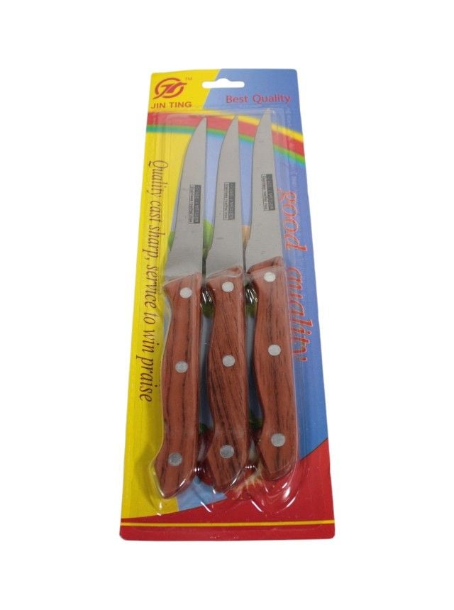 Set 3 Cuțite Engros, 22.5 cm, cu Mâner de Plastic Acest set de 3 cuțite este un produs de bază, esențial pentru magazinele de articole de bucătărie, supermarketuri, librării și chioșcuri. Cu un design simplu și funcțional, aceste cuțite sunt perfecte pentru a simplifica procesul de tăiere a legumelor, fructelor și a altor alimente. Mânerul din plastic asigură o prindere sigură și confortabilă, iar lamele de 22.5 cm sunt potrivite pentru o varietate de utilizări. Este un produs indispensabil, cu o cerere constantă pe piață, fiind ideal pentru orice gospodărie. Avantaje pentru achiziții Engros (B2B): Preț extrem de competitiv: Costul redus de achiziție permite o marjă de profit ridicată, făcându-l un produs ideal pentru vânzări la volum.Produs de bază: Un articol cu cerere constantă, util pentru uz casnic.Ideal pentru vânzări de impuls: Fiind un produs mic, util și la un preț accesibil, este perfect pentru a fi expus la casă sau în zonele cu trafic intens.Versatilitate: Poate fi vândut în diverse locații, de la magazine de articole de bucătărie la librării și supermarketuri.Ambalare practică: Setul de 3 cuțite, ambalat la blister, facilitează stocarea și vânzarea.