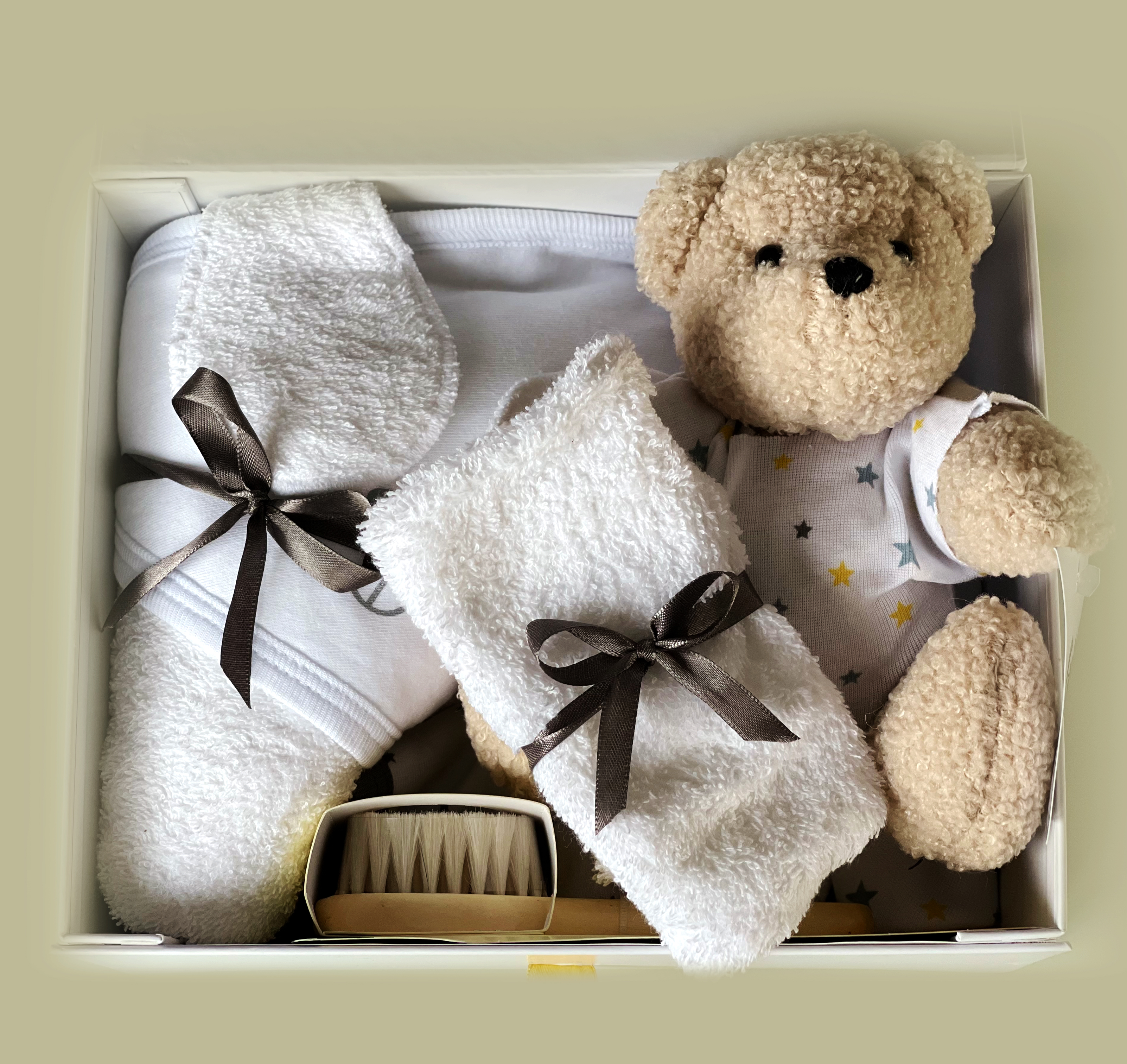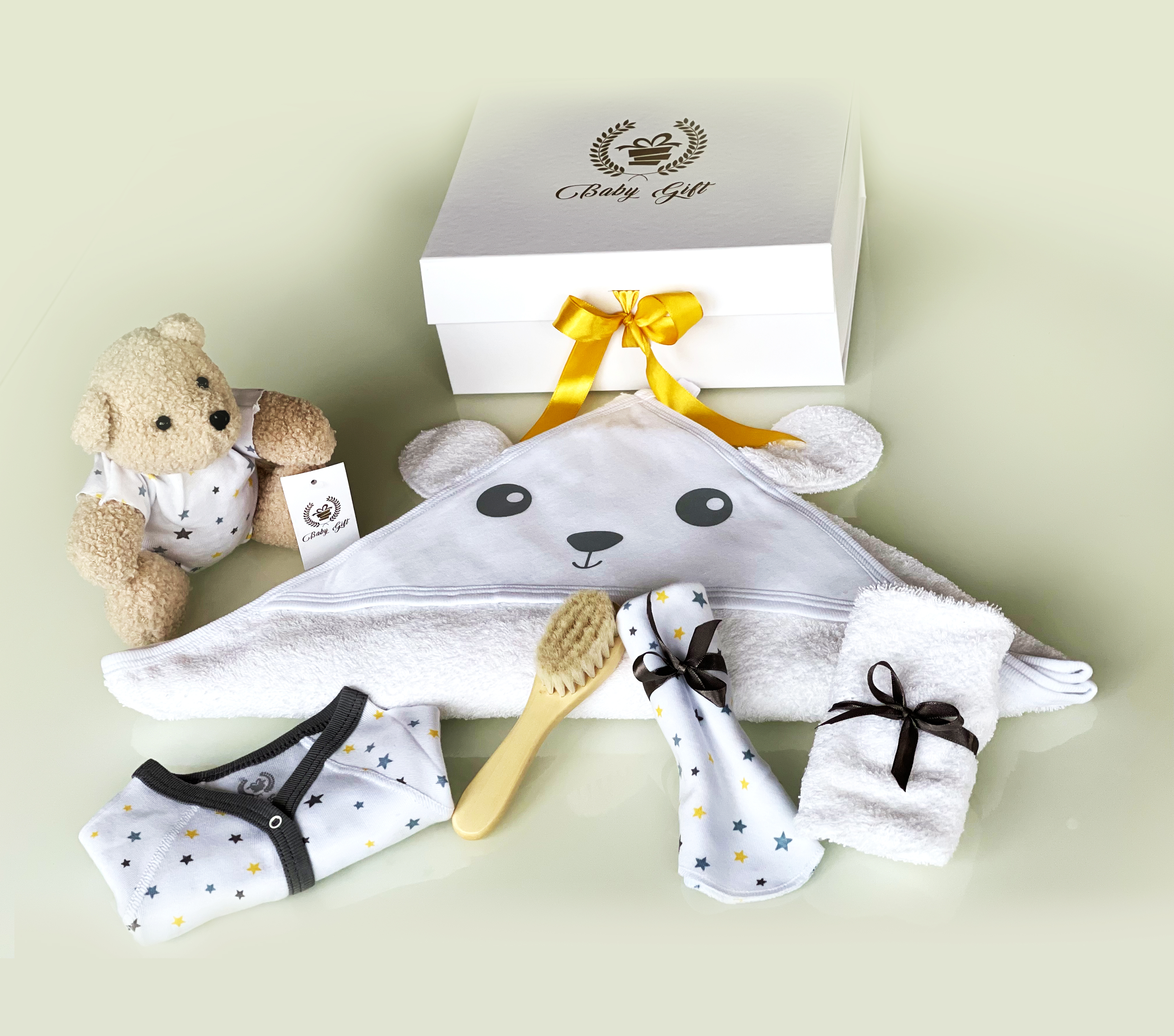 Baita reprezinta o activitate de care merita sa te bucuri din plin alaturi de cel mic.Fie ca iti place sa aveti un ritual pe care sa il desfasurati fara graba, fie ca iti doresti sa fiti practici si rapizi, venim in intampinarea voastra cu un set cu produse utile ce vor face din baita o experienta frumoasa.Produsele vin ambalate in cutia de cadou premium Baby Gift (dimensiuni 25x21x10cm), prinse cu o funda de matase, asa cum reiese din poze.*Marimi disponibile: 0-12 luni;Pachetul contine:1 x Pijama cu maneca lunga si cu botosi1 x Batista1 x Prosop bebe cu gluga1 x Manusa baie1 x Perie lemn cu par natural1 x UrsuletToate articolele textile sunt fabricate din bumbac 100%.Hainele sunt fabricate din bumbac moale, certificat OEKO-TEX® Standard 100, ce asigura confortul bebelusului si garanteaza sanatatea pielii.Etichetele cu marimea si conditiile de intretinere sunt aplicate prin serigrafie. Vopselurile folosite sunt de calitate superioara si nu contin substante care sa irite pielea sensibila a copilului.Cusaturile sunt realizate astfel incat sa nu irite pielea copilului.Tesaturile sunt moi, placute la atingere, rezistente la utilizari multiple si spalari repetate:Ursuletul este realizat 100% din poliester (interior si exterior). Fabricat din materiale moi. Contine piese mici ce pot fi inghitite.Dimensiunile periei sunt 15x4 cm. Produsul este nou si comercializat in ambalajul original al producatorului.Afla mai multe detalii despre ingrijirea produsului mai jos.Spalati la masina de spalat, max. Temp.40 ° C, ciclu scurtNu folositi inalbitorNu uscati prin centrifugareCalcati la temp.max. 110 ° C - fara aburNu se curata chimic
