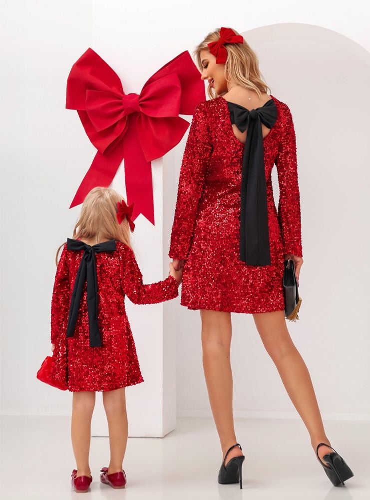 Set Rochii elegante mama-fiica, din paiete, cu funda supradimensionata, Rosii