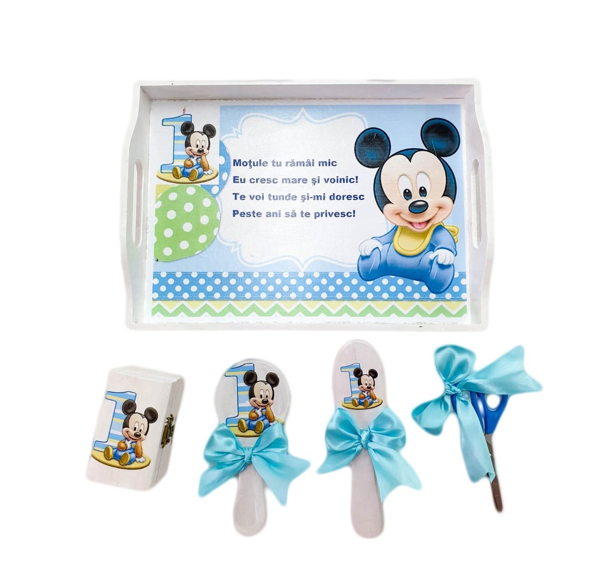 Set Taiere Mot Cinci Piese, baby Mickey, pentru baietelul tau. Set din lemn pentru fetite. Are accesoriile potrivite evenimentului. Setul este format din: tava cu imprimeu viu colorat si cu mesaj, oglinda, perie de par, cutie, foarfec. Toate accesoriile sunt asortate. Set Taiere Mot Cinci Piese, baby Mickey, poate fi un cadou din partea nasilor la taierea motului.