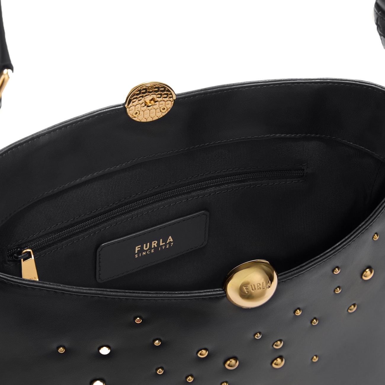 Geanta Furla Sfera Soft atrage privirile prin designul său rafinat și textura geometrică embosată în piele nappa moale, care conferă un aspect luxos și modern. Forma curbată și linia delicată a clapetei sunt accentuate de închiderea metalică rotundă în nuanță aurie, în timp ce cureaua de umăr ajustabilă oferă versatilitate și confort la purtare.