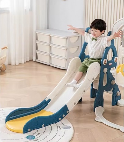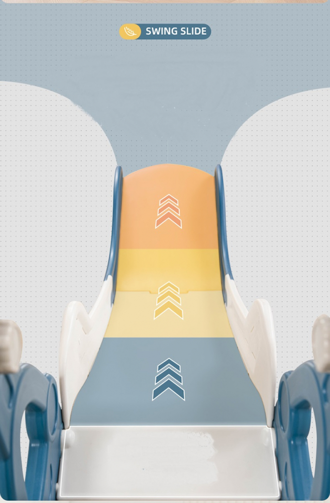 Tobogan pentru copii Nichiduta Garden Rocket Blue de interiorexterior, design pliabil, prevazut cu scara si manere de sustinere, cu mini-cos de Baschet, dimensiune 150 x 38 x 91 cm