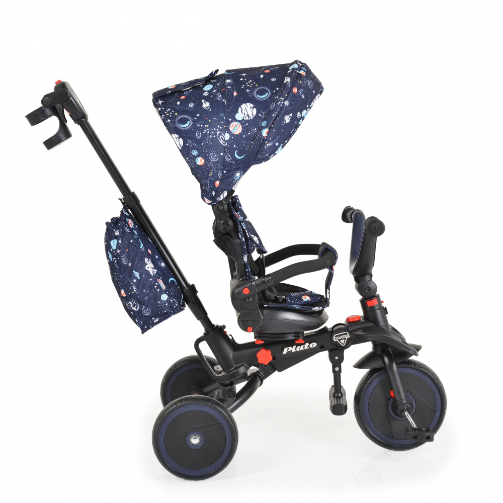 Tricicleta pentru copii Byox Pluto Blue pliabila, cu scaun rotativ si spatar reglabil , roti din cauciuc Eva, maner cu control al directiei, 2 seturi suport picioruse, sistem roata libera si frana pe rotile din spate