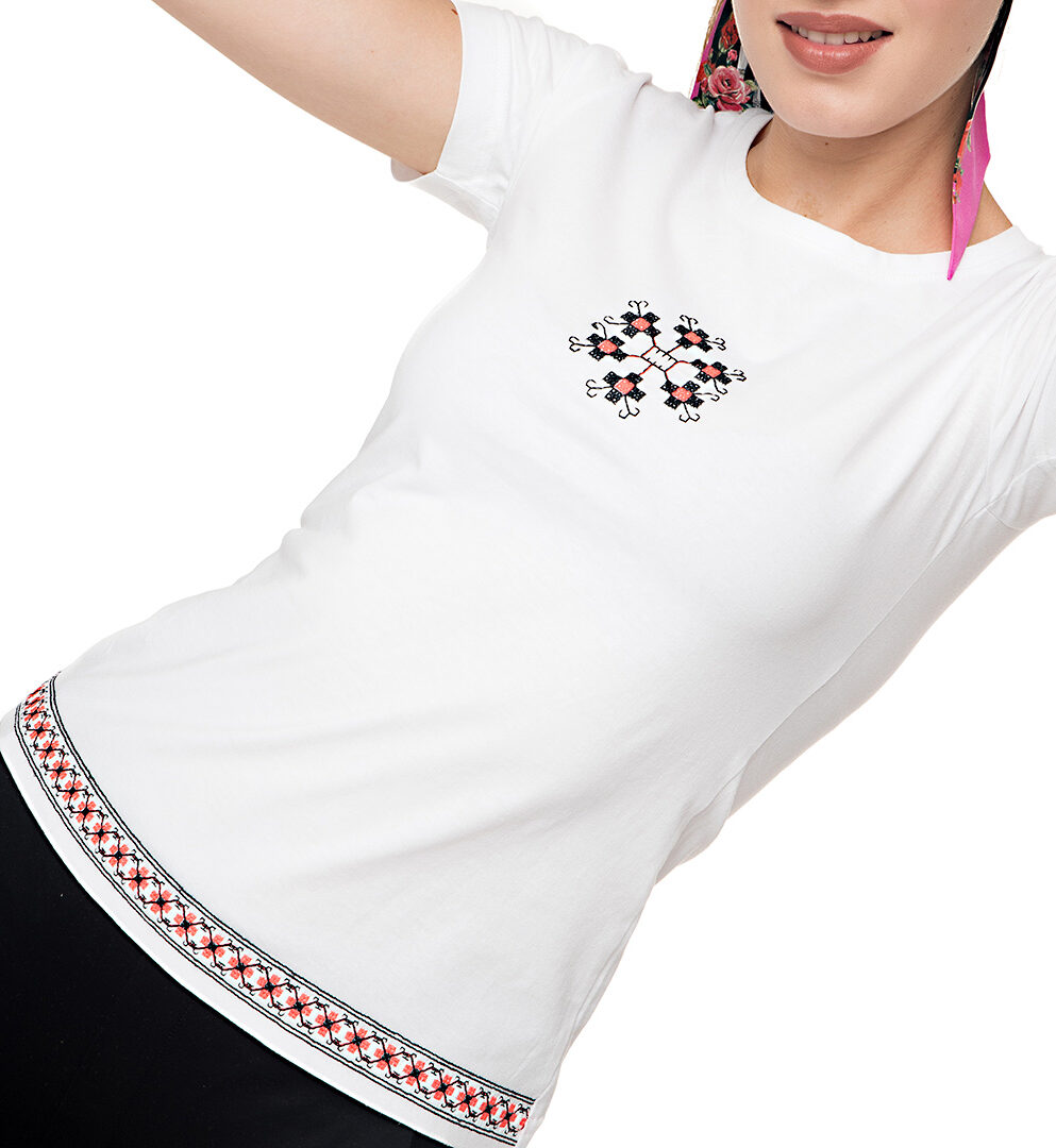 Tricou din bumbac organic alb, croiala cambrata, prezinta broderie frontala de culoare fucsia neon si negru.Colectia de tricouri The Dresser aduce impreuna ceva nou si ceva cu traditie. Creeaza o armonie intre prezent si trecut, spunandu-ti subtil cine esti si de unde ai venit. Iata cum cea mai versatila piesa vestimentara – tricoul alb, devine o piesa unica in garderoba ta, odata cu motivele traditionale brodate direct pe tesatura din bumbac. Aerul cool, urban al tricoului este dat de culorile vibrante si broderia realizata.Indiferent de stilul pe care il ai, vei putea realiza lejer o tinuta atat in sezonul cald cat si cand e frig, acompaniat de cardigane, pulovere ori sacouri. Si nu uita: cele mai surprinzatoare tinute sunt cele care sparg monotonia si incalca reguli.Tricou din bumbac organic, de culoare alba;Prezinta pe partea frontala, broderie cusuta direct pe material;Model broderie realizat cu motive traditionale romanesti, reinterpretate;Broderia este realizata din ata de culoare fucsia neon si negru;Partea din spate este simpla, fara desene sau aplicatii;Model cu croiala cambrata;Maneci simple, scurte, confectionate din acelasi material;Ambalat in plic personalizat, 100% biodegradabil;Fabricat in Romania.Compozitie:100% bumbac organic.160g/m2, bumbac obtinut din culturi ecologice, croiala cambrata ce prezinta cusaturi laterale, tivul gulerului este din acelasi material de baza, cu 5% adaos elastan, interiorul gulerului prezinta banda de intarire din acelasi material de baza, la nivelul umerilor este aplicata o cusatura de intarire, marginea inferioara este curbata.