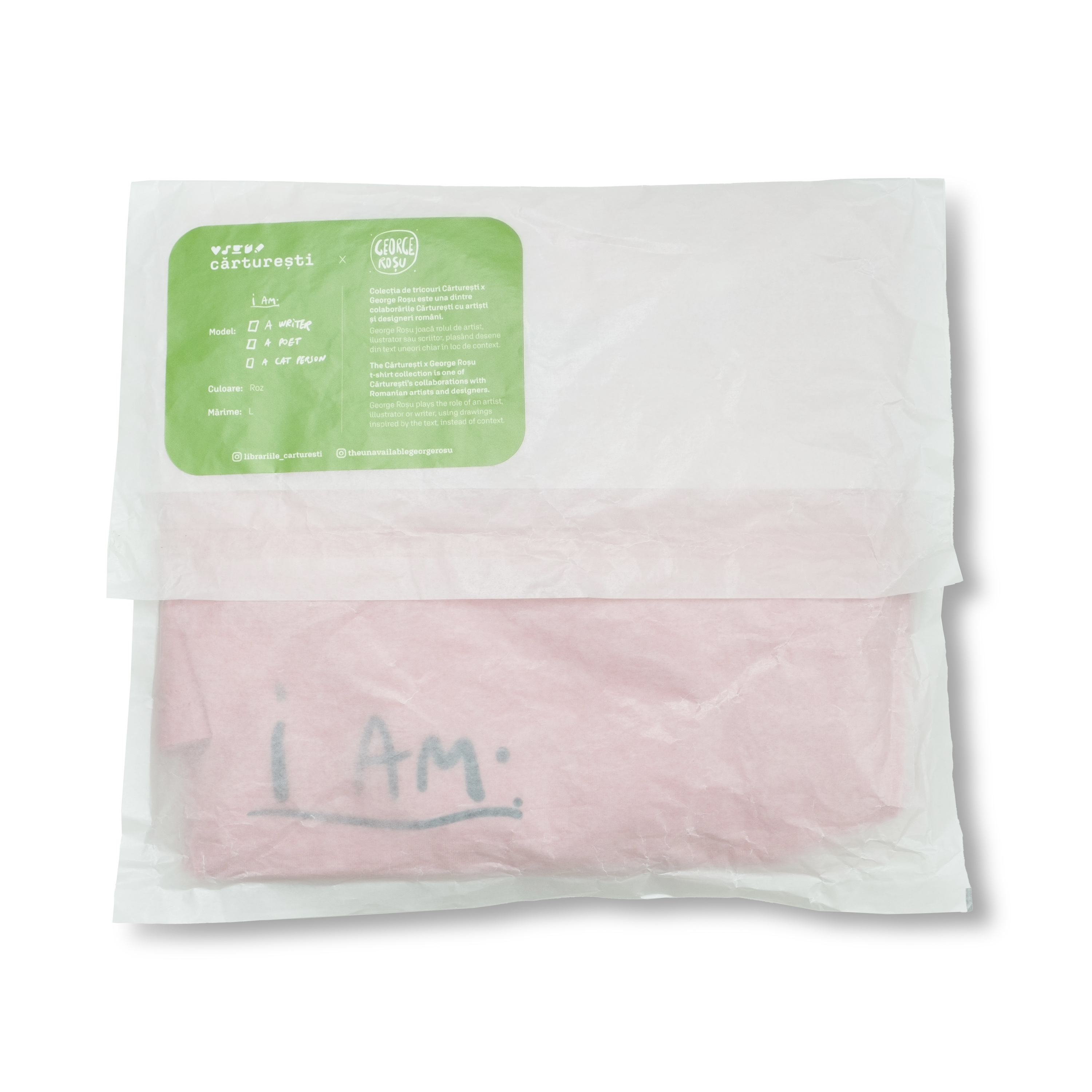 Colectia de tricouri Carturesti x George Rosu este una dintre colaborarile Carturesti cu artisti si designeri romani.George Rosu joaca rolul de artist, ilustrator sau scriitor, plasand desene din text uneori chiar in loc de context.Tricourile sunt fabricate din bumbac 100% organic.