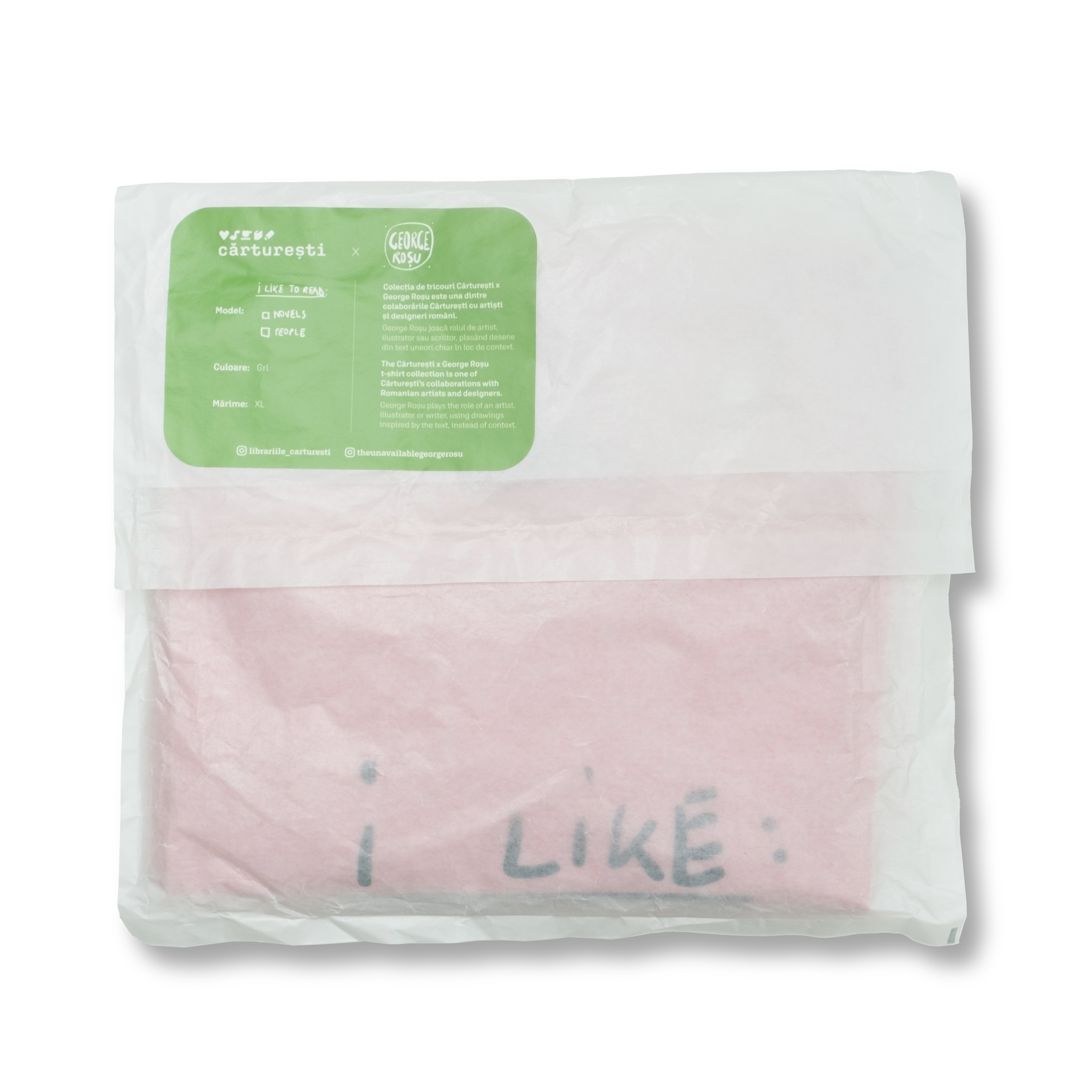 Colectia de tricouri Carturesti x George Rosu este una dintre colaborarile Carturesti cu artisti si designeri romani.George Rosu joaca rolul de artist, ilustrator sau scriitor, plasand desene din text uneori chiar in loc de context.Tricourile sunt fabricate din bumbac 100% organic.
