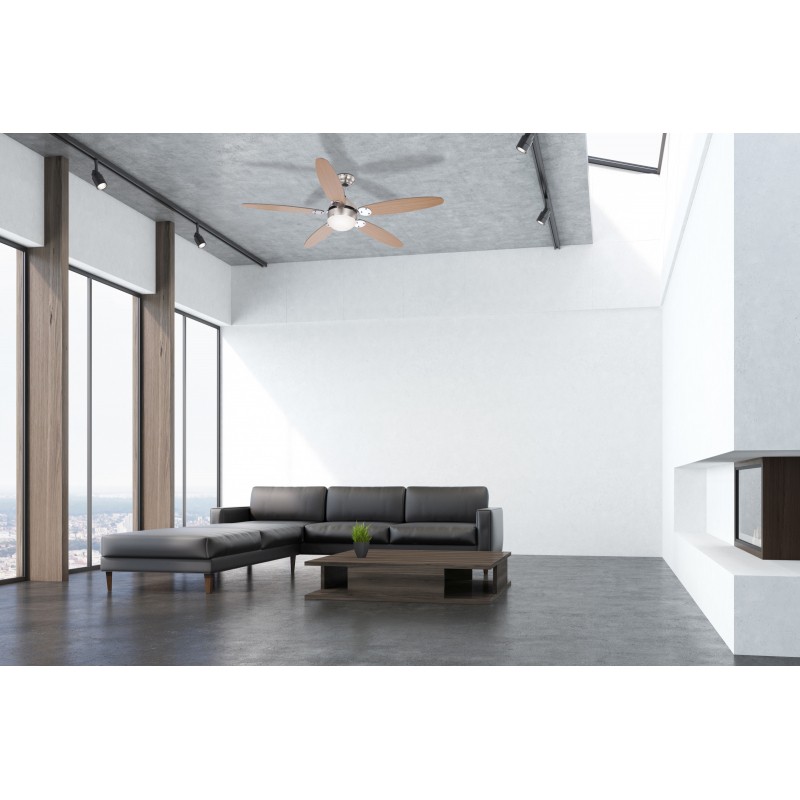 Ventilator reversibil cu lustra, 5 palete, 60W, 3 trepte viteza, montare tavan, E14 Ventilator de tavan este alegerea potrivita pentru a racori incaperea in zilelel caluroase de vara. Acesta indeplineste 2 functii, atat de ventilator cat si de lampa fiind prevazut cu dulie E14. Ventilatorul dispune de 3 viteze si are o putere de 60W. Paletele ventilatorului pot fi rotite in ambele directii si dispune de 2 fete, una maro si una gri avand posibilitatea de a opta pentru culoarea care se potriveste cel mai bine cu decorul din incapere. Caracteristici: - ventilator cu lustra; - prevazut cu 5 palete; - paletele dispun de 2 fete: maro si gri; - 3 trepte de viteza; - putere 60W; - miscarea paletelor este reversibila; - prevazut cu comutator tip lant; - 1 x dulie E14; - becul nu este inclus; - 2 moduri de functionare: ventilator si lampa; - factor de protectie IP20; - functioneaza prin alimentare la reteaua electrica; - tensiune de alimentare 230V; - material structura metal; - material abajur sticla; - dispune de un design simplu si elegant; - se potriveste usor cu orice decor; - diametru 132 cm; - inaltime 40.6 cm; - culoare maro-gri.
