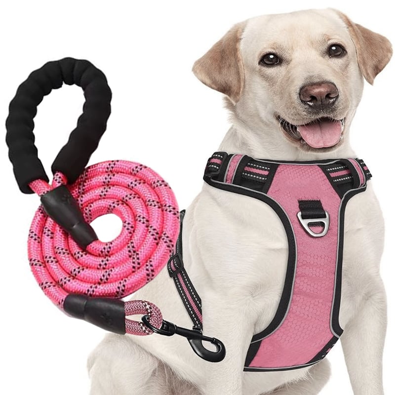 Set Ham și Lesa, pentru Caini, Marimea XL, Benzi reflectorizante, Maner control, Material textil, Roz Engros