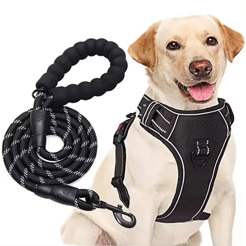 Set Ham și Lesa, pentru Caini, Marimea L, Benzi reflectorizante, Maner control, Material textil, Negru Engros