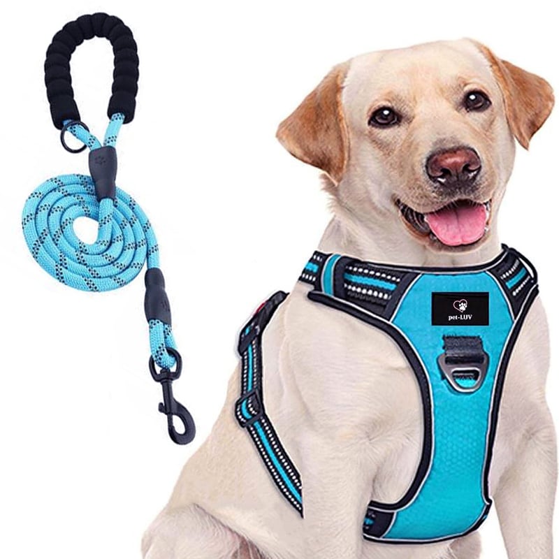 Set Ham și Lesa, pentru Caini, Marimea L, Benzi reflectorizante, Maner control, Material textil, Albastru Engros